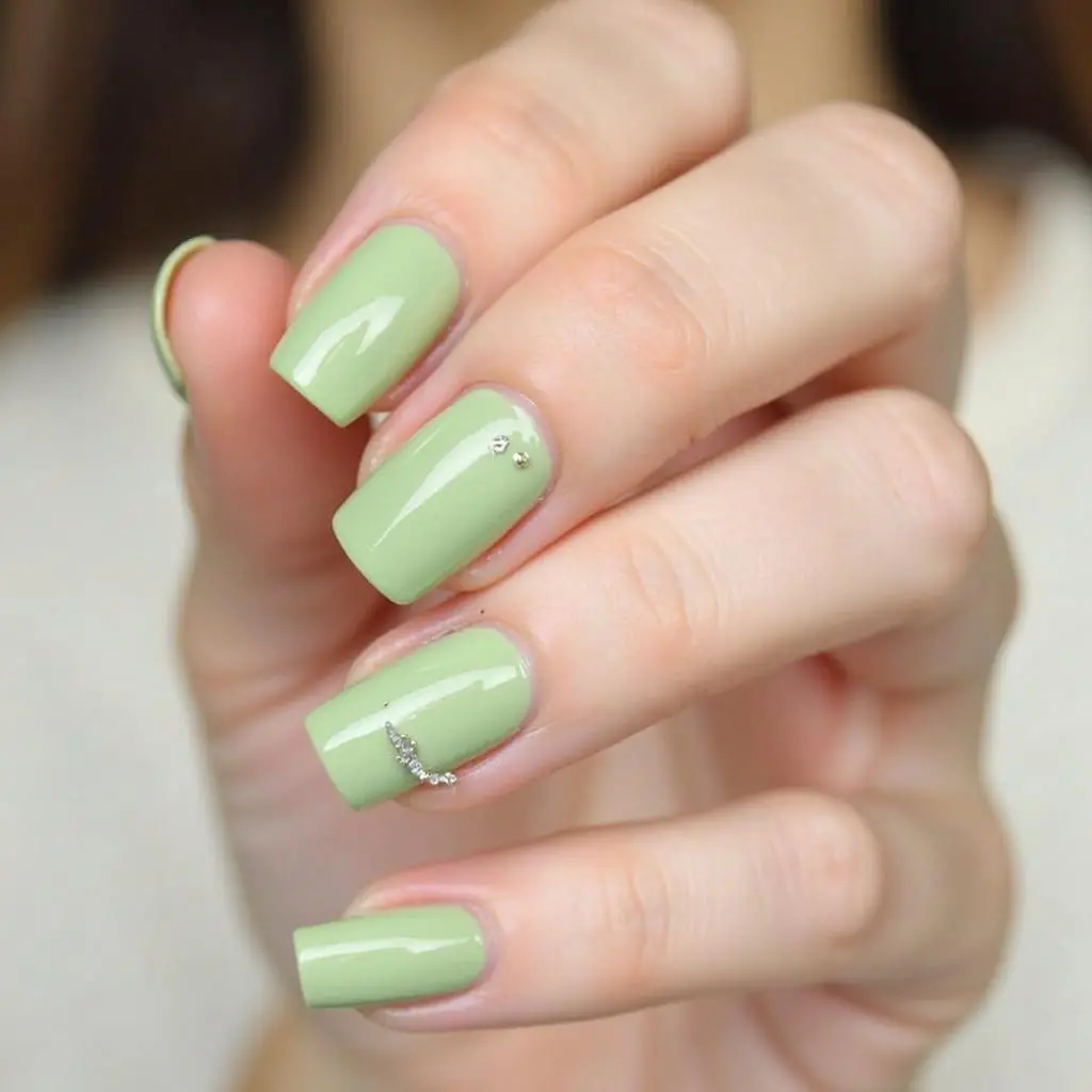 Apply rhinestones to one or two nails for a touch of luxury and sparkle, while keeping the rest of your nails in pastel green.