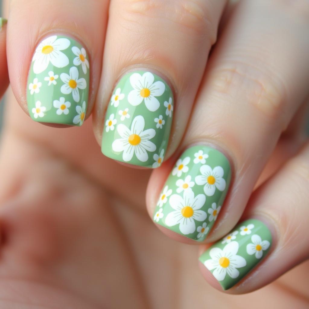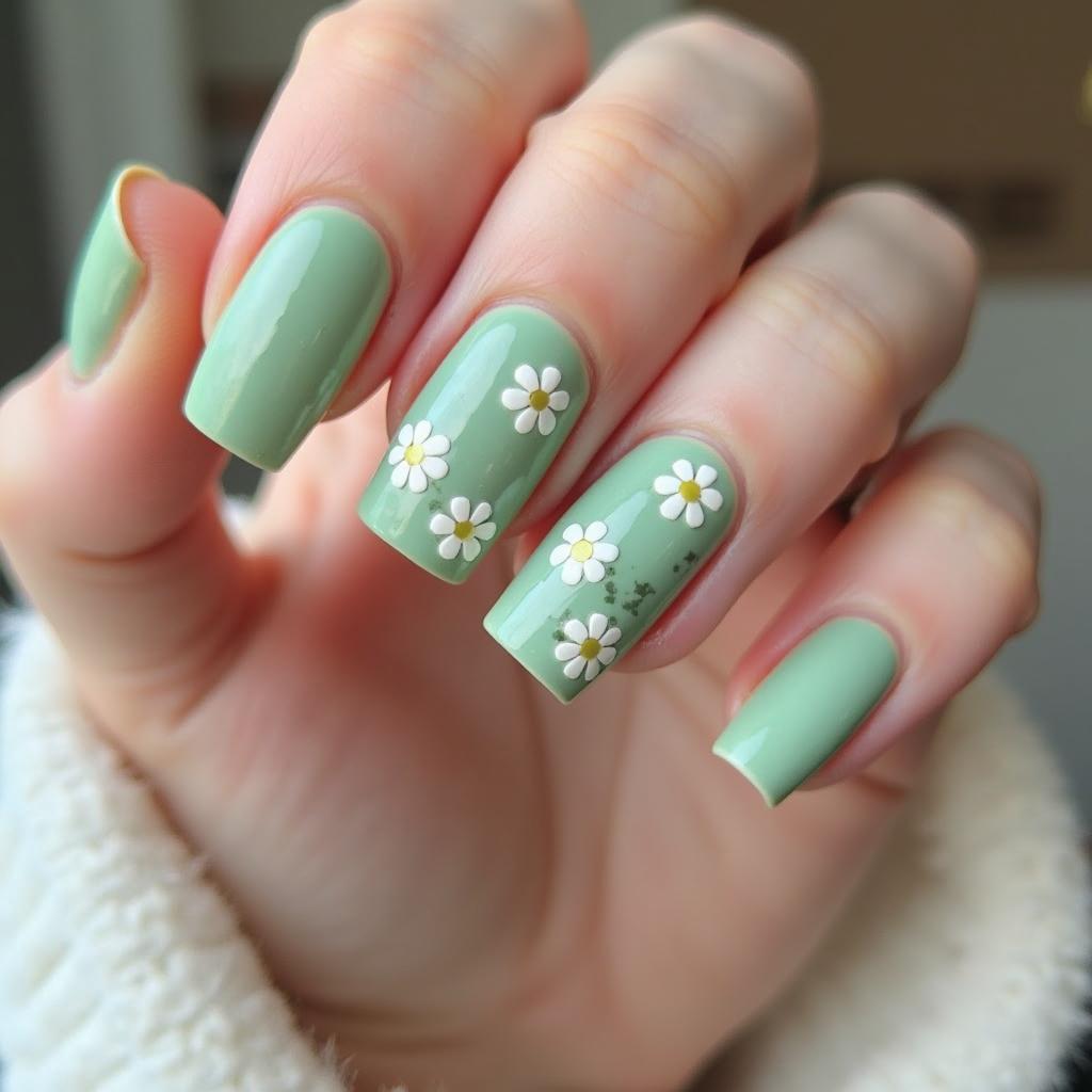 Add tiny white flowers with fine details to your pastel green nails for a dainty and feminine touch.