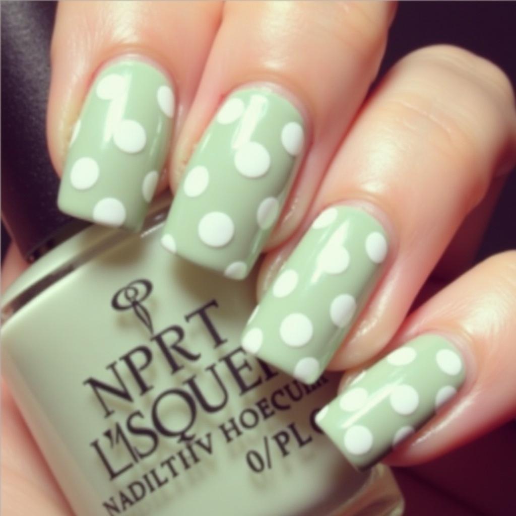 For a bold look, paint larger white polka dots on your pastel green nails for a fun, cheerful design.