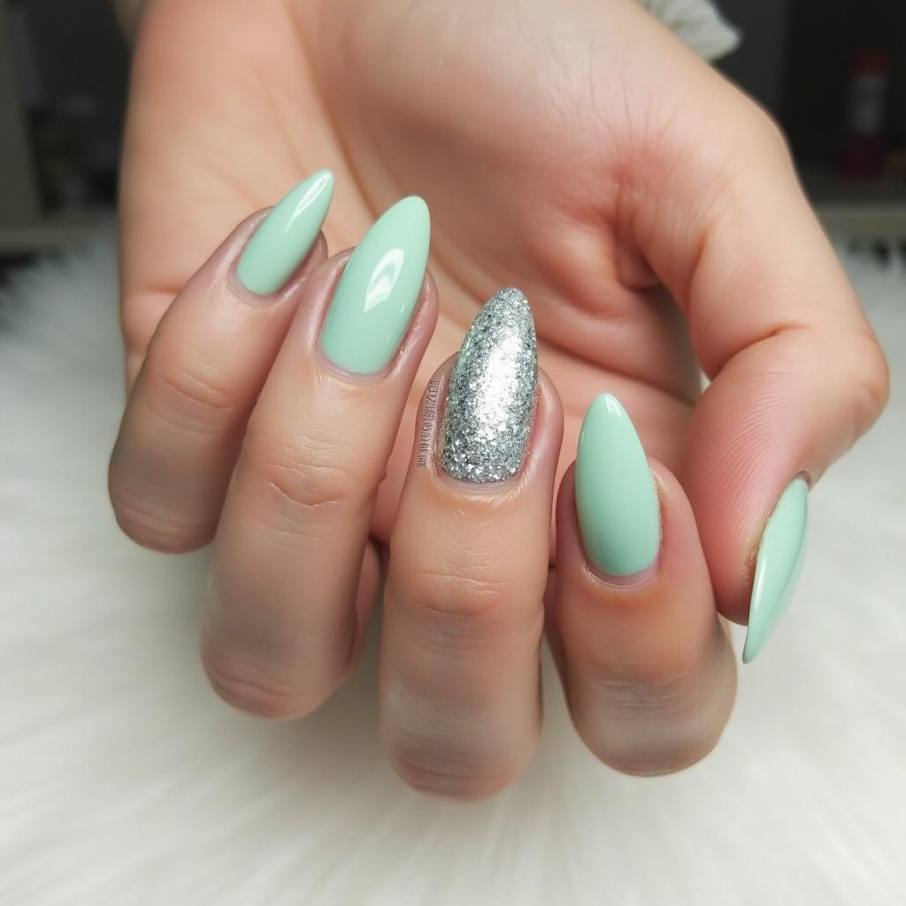 Apply silver glitter to one or two nails on each hand for an accent nail design that complements the soft pastel green base.