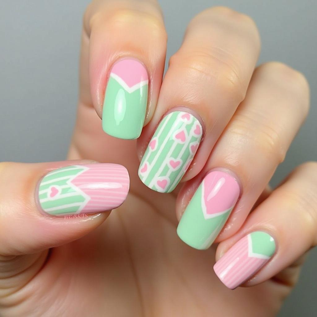 Add small pink hearts to your pastel green nails for a sweet, romantic touch.