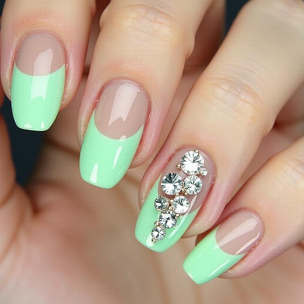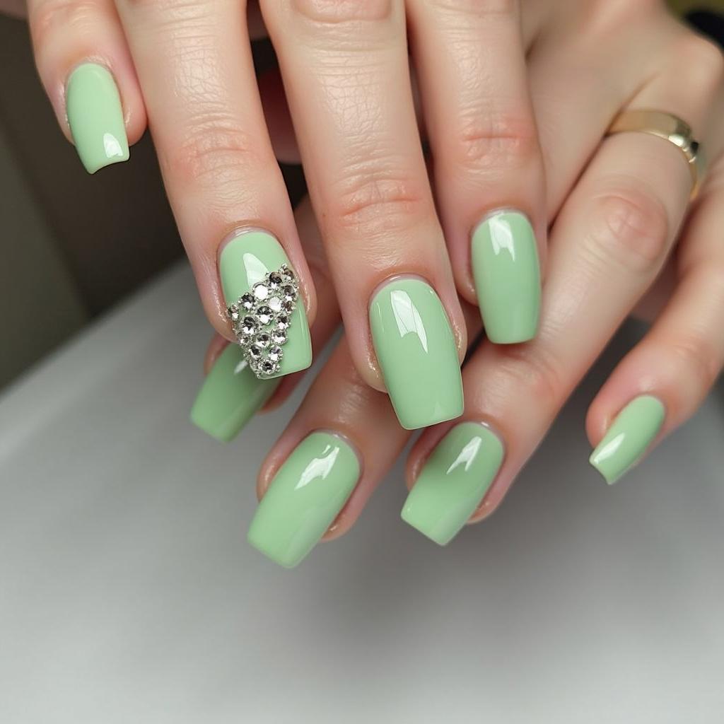Apply rhinestones to one or two nails for a touch of luxury and sparkle, while keeping the rest of your nails in pastel green.