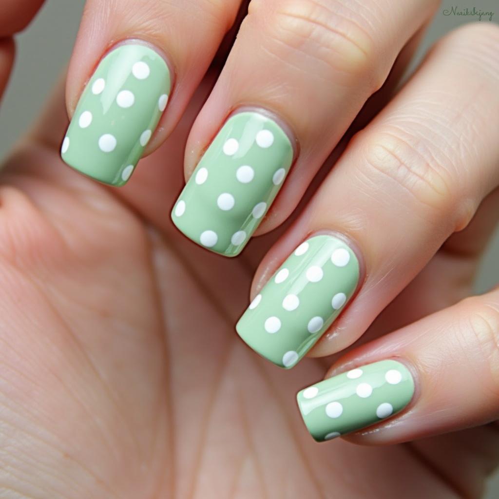 Add tiny white polka dots to your pastel green nails for a cute and retro-inspired design.