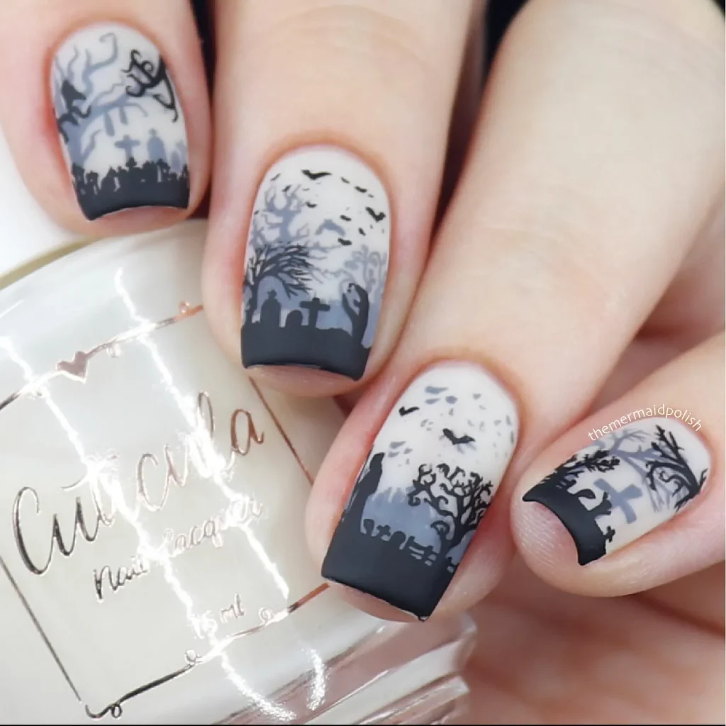 Once it’s dry, use a thin black brush to paint simple silhouettes at the tip of your nail think tombstones, bare trees, or a creepy fence.