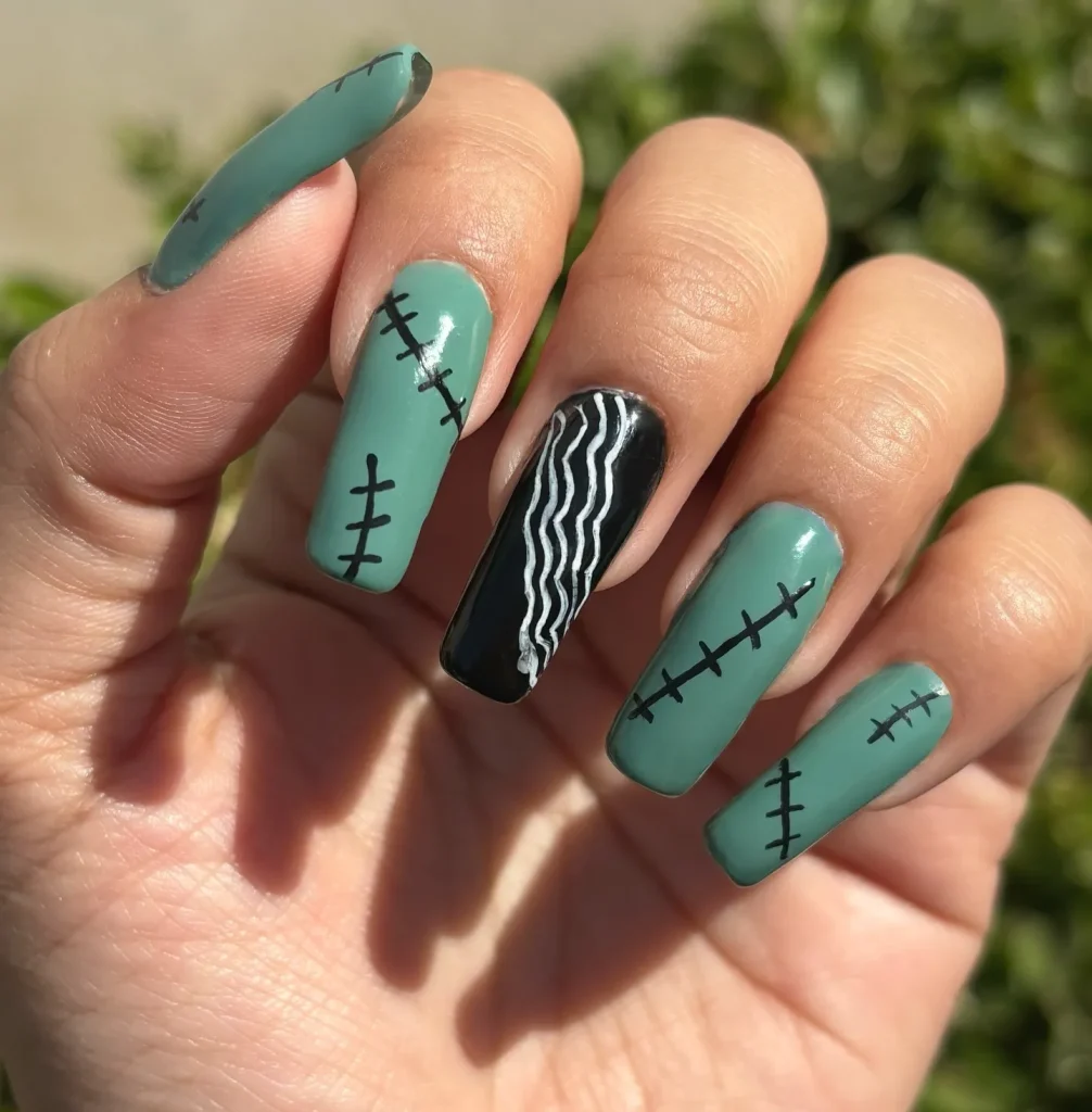 This one brings all the mad scientist vibes. Paint your nails a ghoulish green.