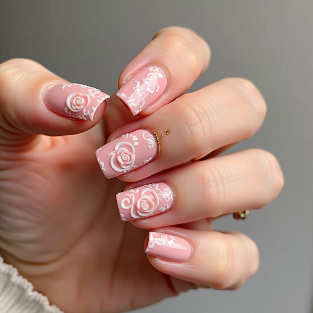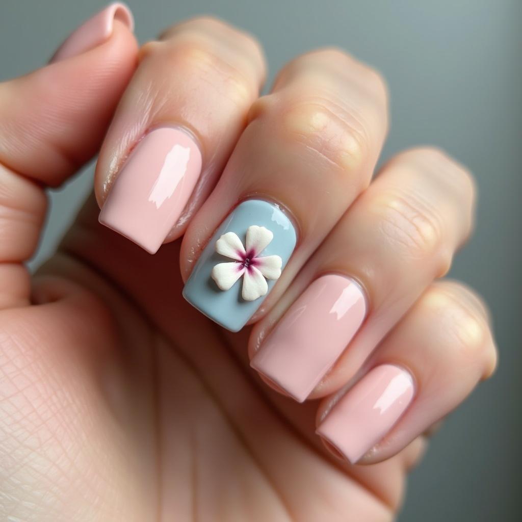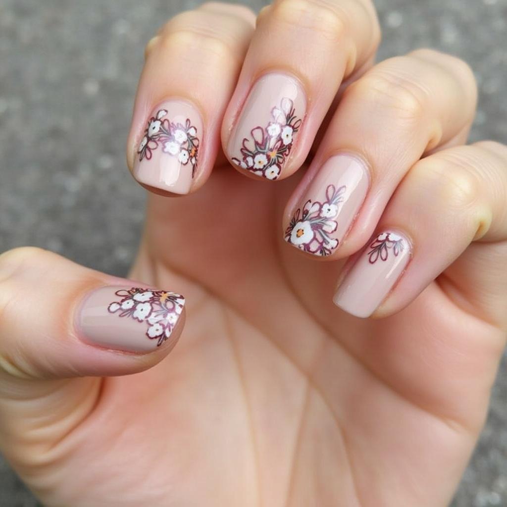 Choose a neutral nail color like beige or pale pink for most nails, and add a single bloom on an accent nail for a delicate touch.
