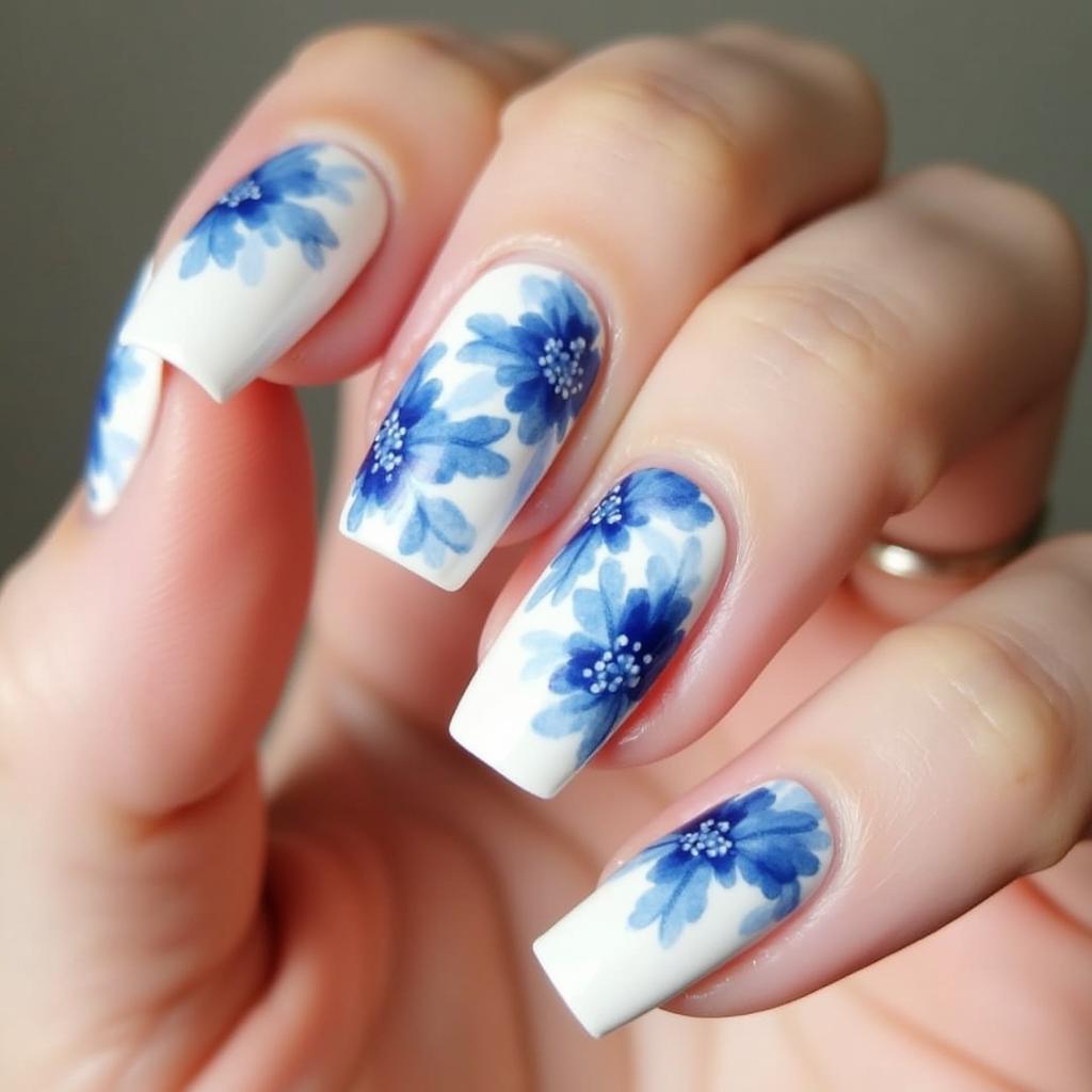 Create a calming design with blue and white watercolor flowers, giving your nails a cool and serene vibe.
