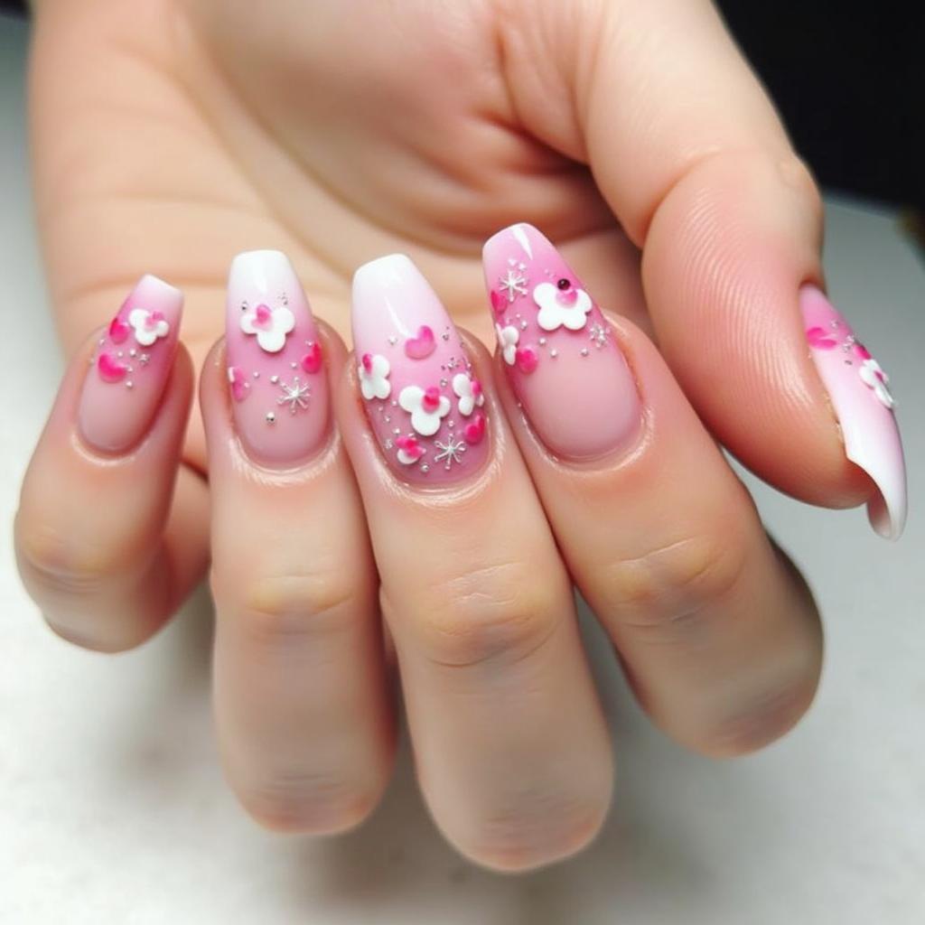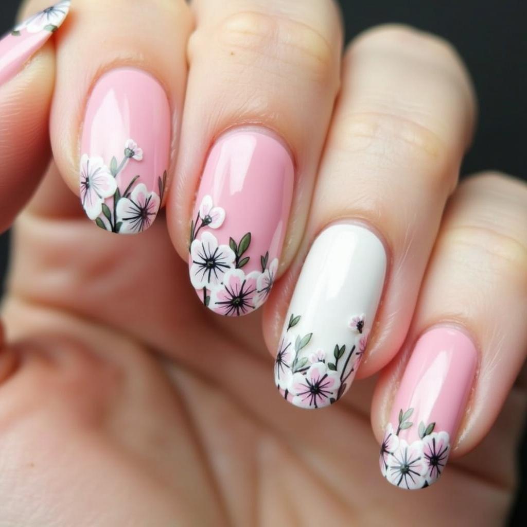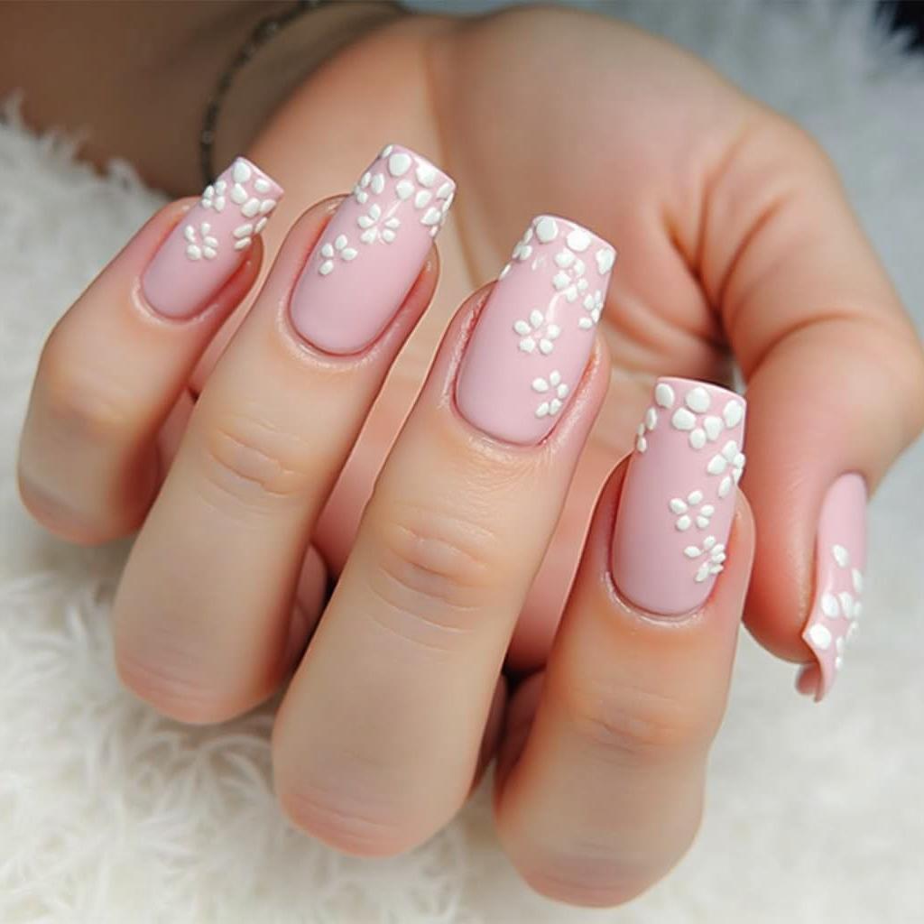 Create a soft gradient from pink to white and add small flowers along the cuticle or tip for a gentle, romantic effect.