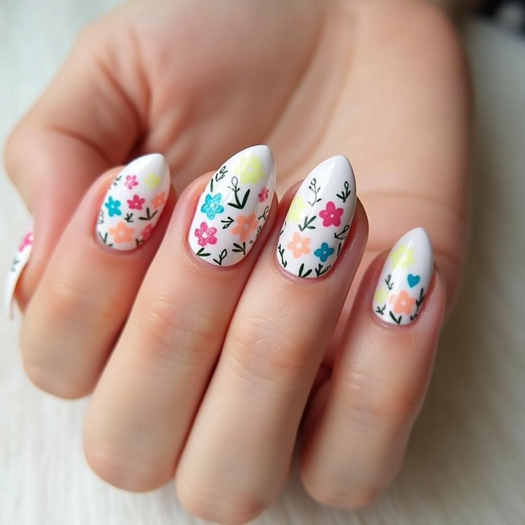 Use a range of bright colors like orange, purple, and blue to paint wildflowers on your nails for a vibrant, playful look.