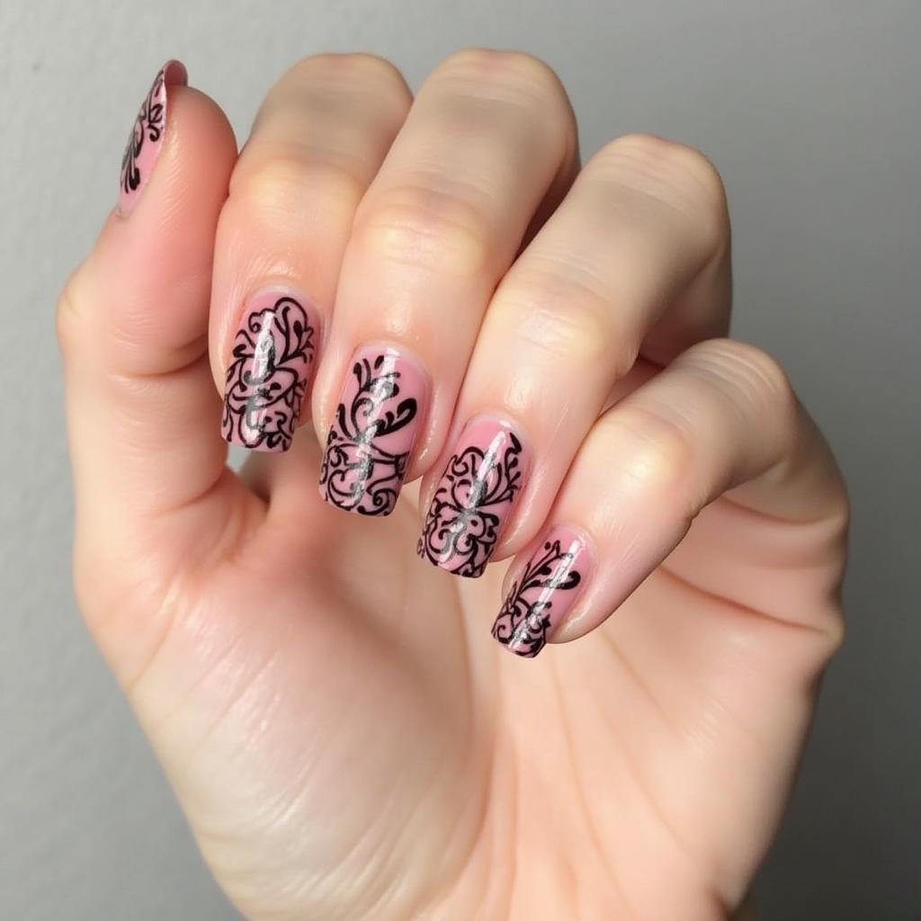Opt for a lace floral stamping design in white or silver for a delicate, romantic aesthetic.