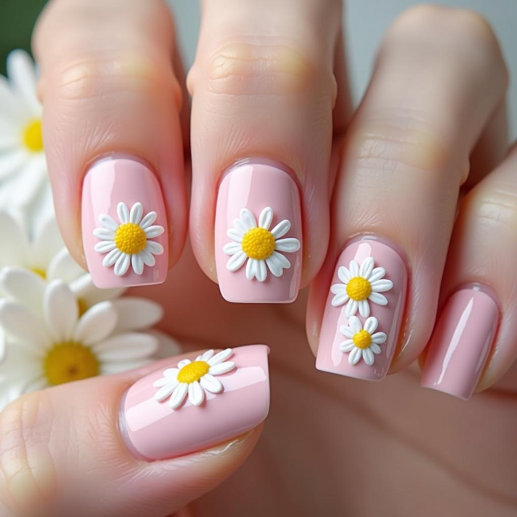 Paint small white daisies with yellow centers on a soft pink background for a cute and feminine design.
