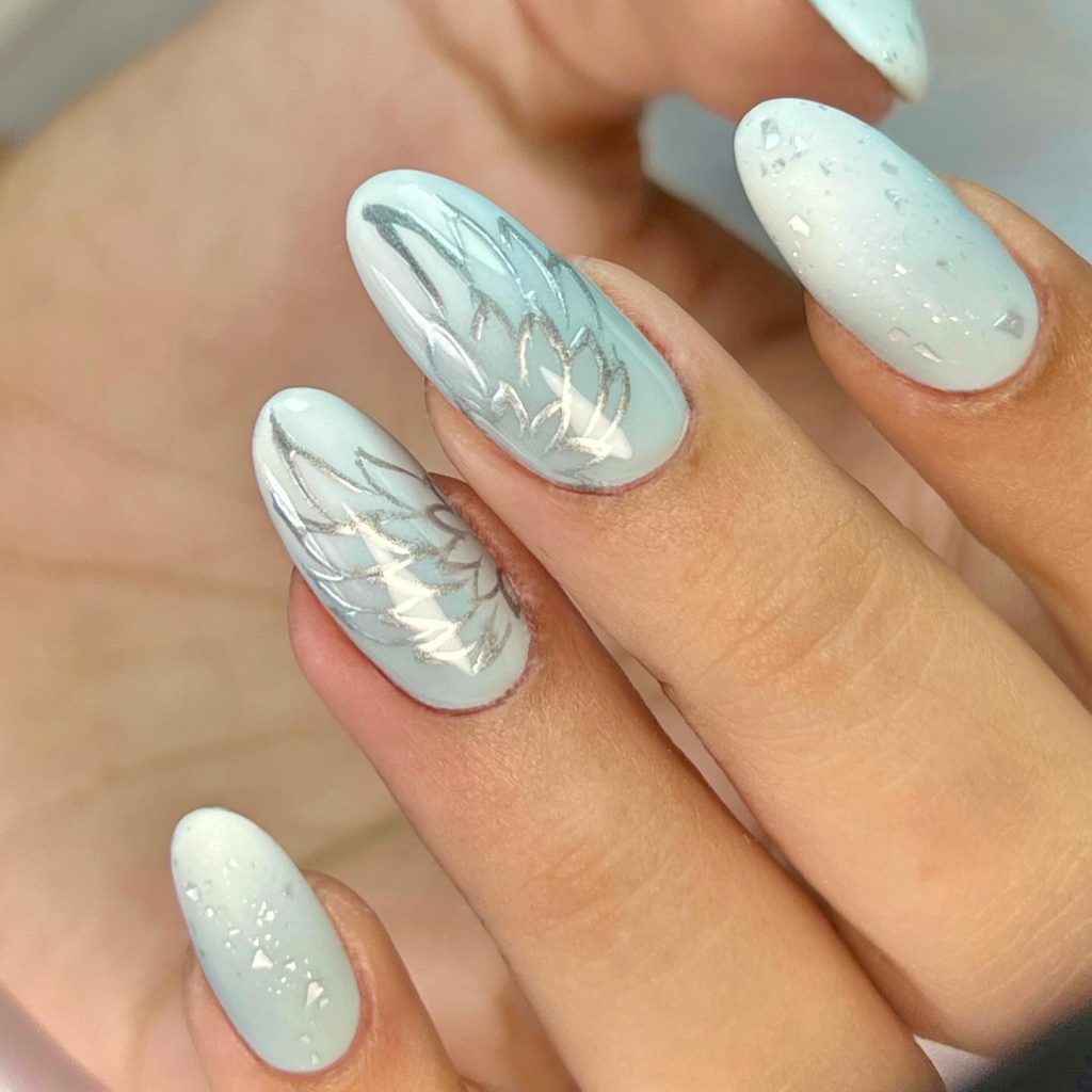 Silver foil accents on a deep blue or white base give your nails a chic, wintery touch. The foil creates an icy, frosty effect that captures the cold beauty of winter while remaining ultra-glamorous.