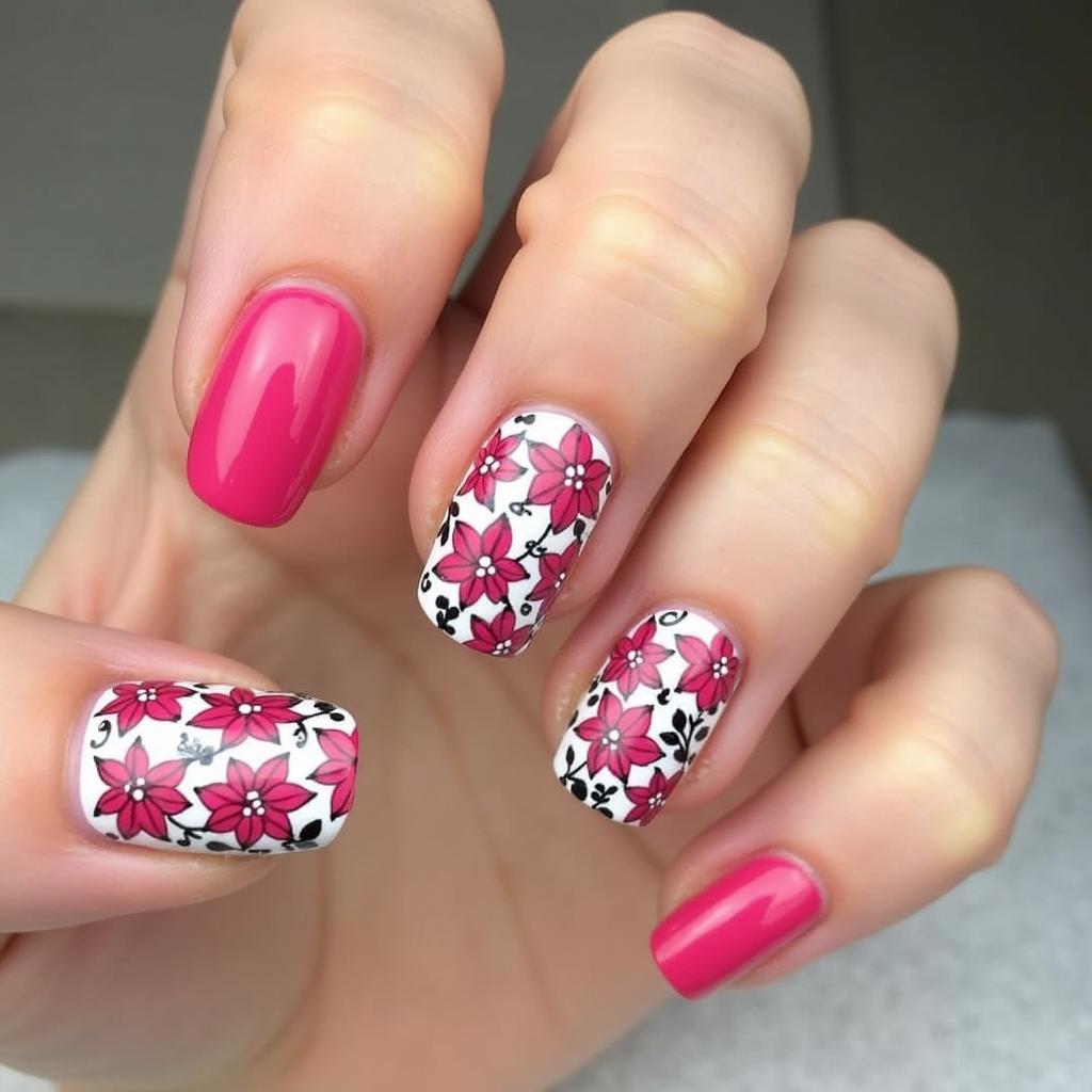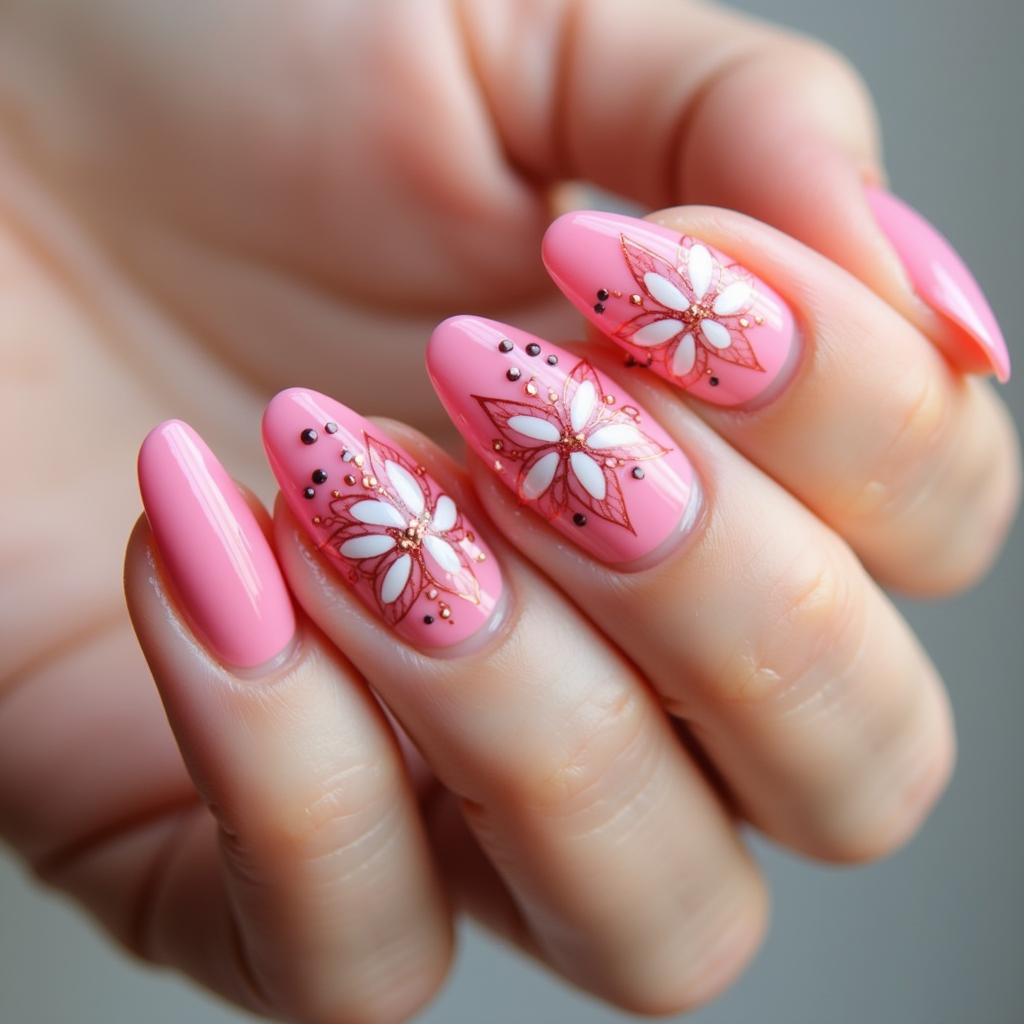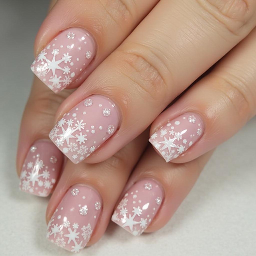 Pair a soft pink base with glittering snowflakes for a winter wonderland effect. The pink provides a cheerful base, while the silver or white snowflakes add just the right amount of sparkle for the season.