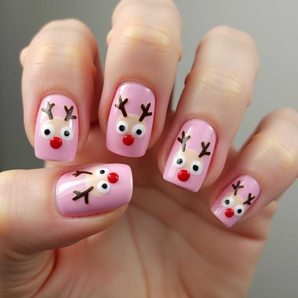 Add a touch of whimsy with tiny reindeer faces painted on your accent nails. Use pink for the nose and soft brown or tan for the rest of the face, creating an adorable and playful design that captures the spirit of Christmas.