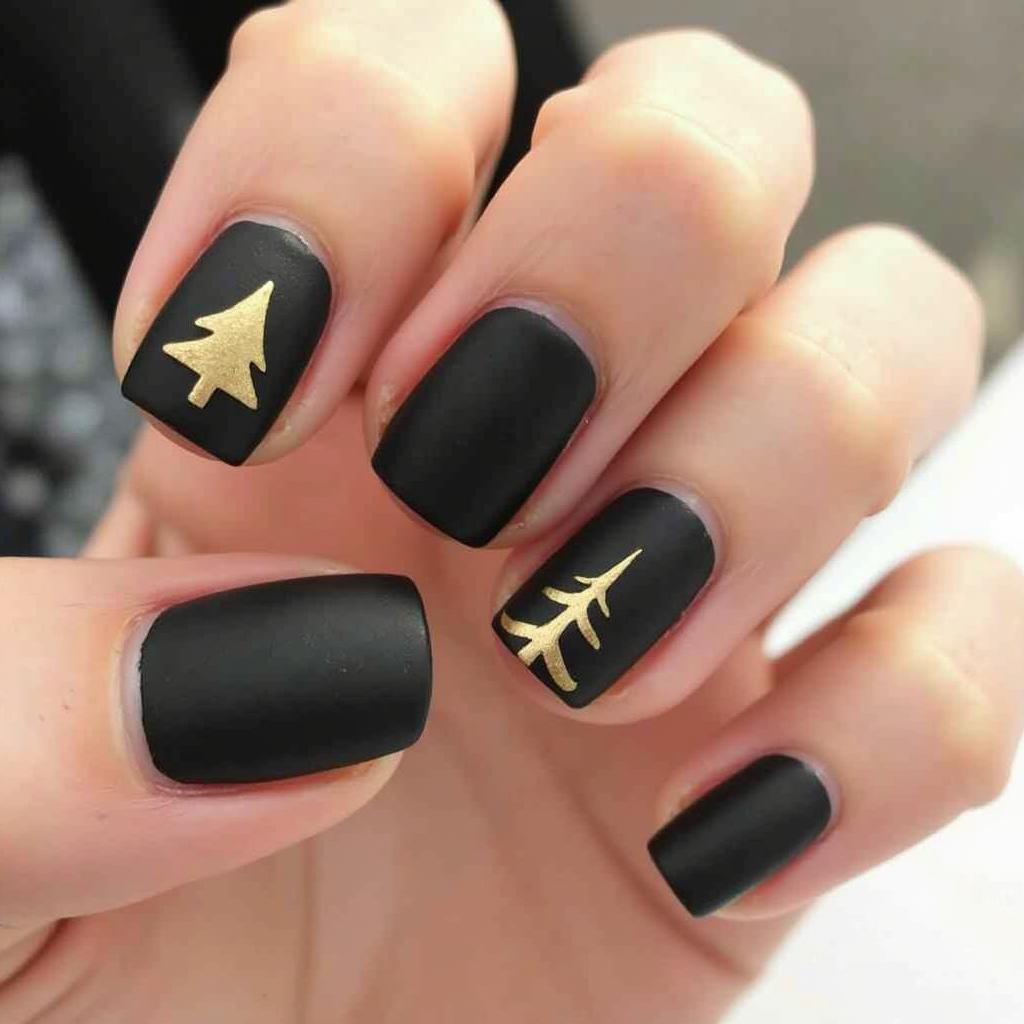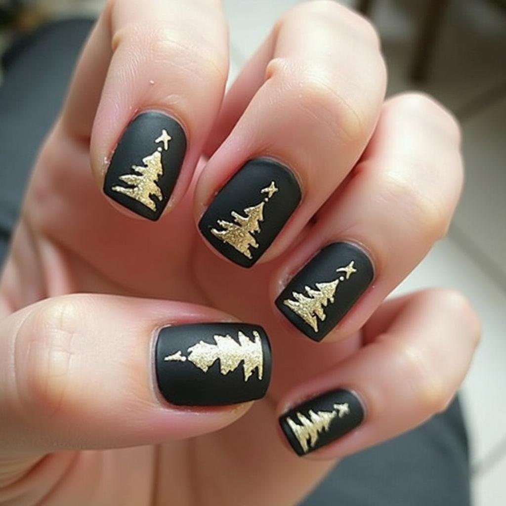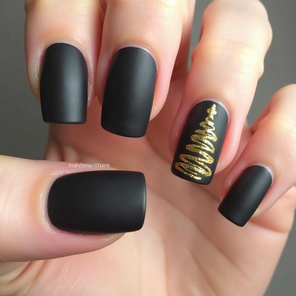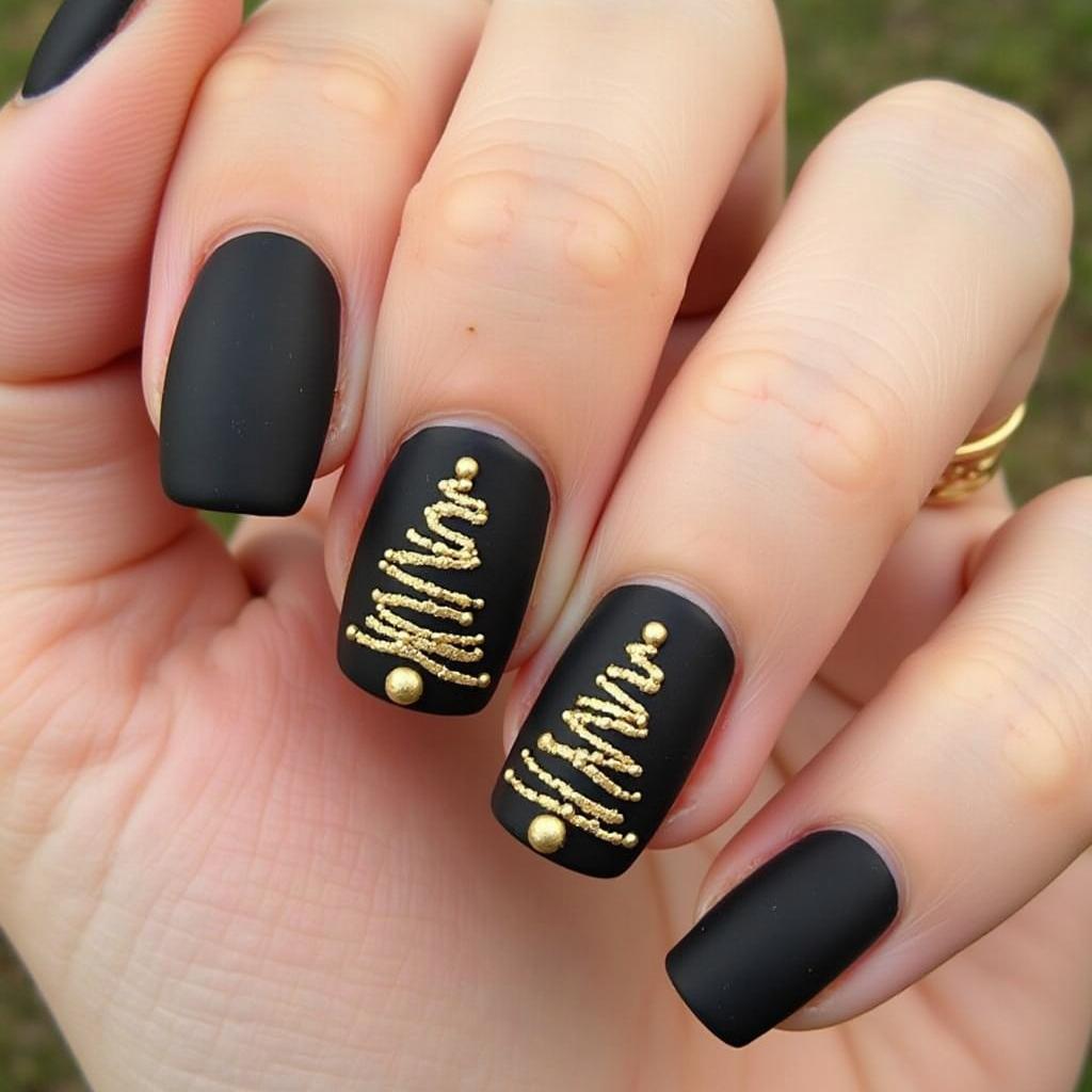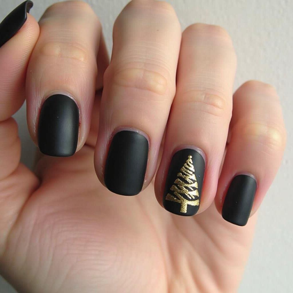 Matte black almond nails with gold Christmas tree designs on the accent nails provide a bold yet elegant look. The matte black base lets the intricate gold designs stand out, creating a sophisticated holiday look with a festive twist.