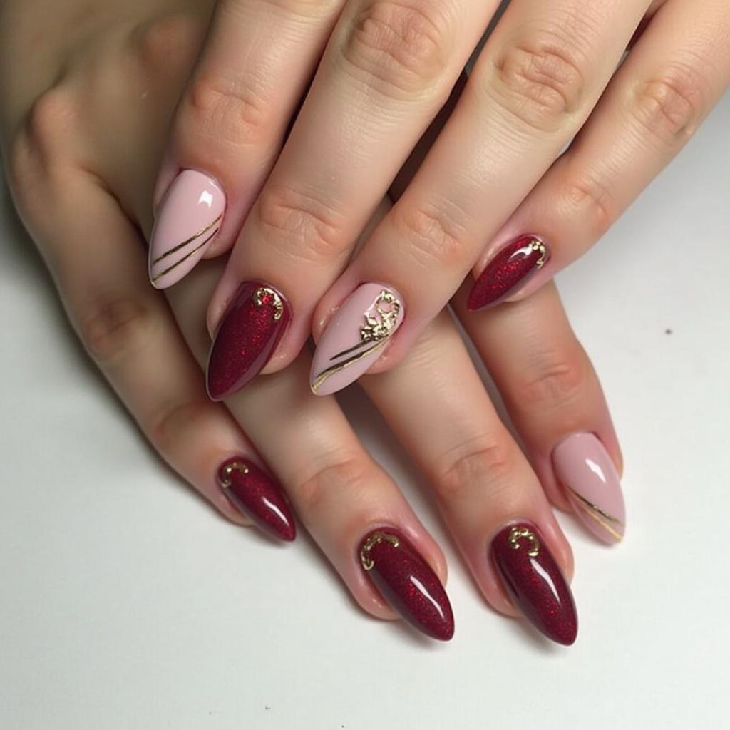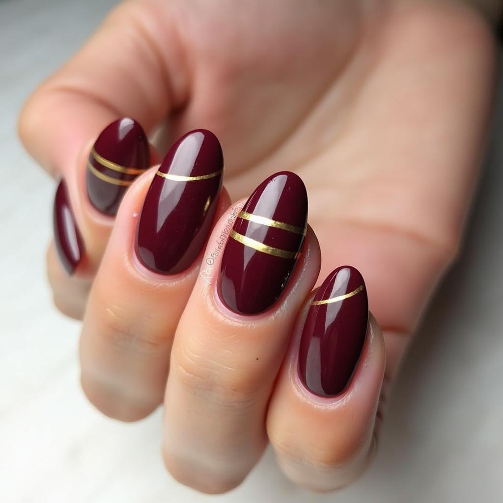 Burgundy almond nails with thin gold stripes create a luxurious holiday design. The combination of rich red tones with the metallic gold adds an elegant touch that’s perfect for a formal holiday event.