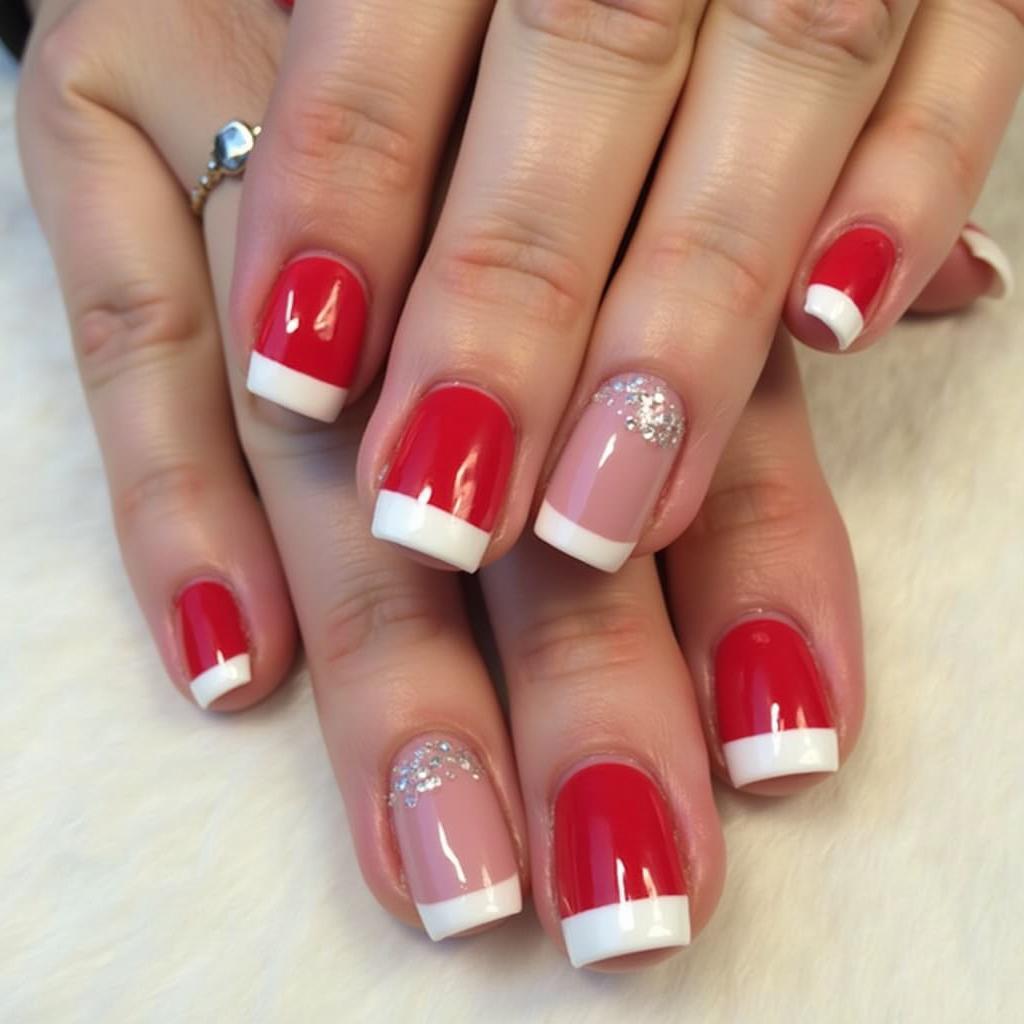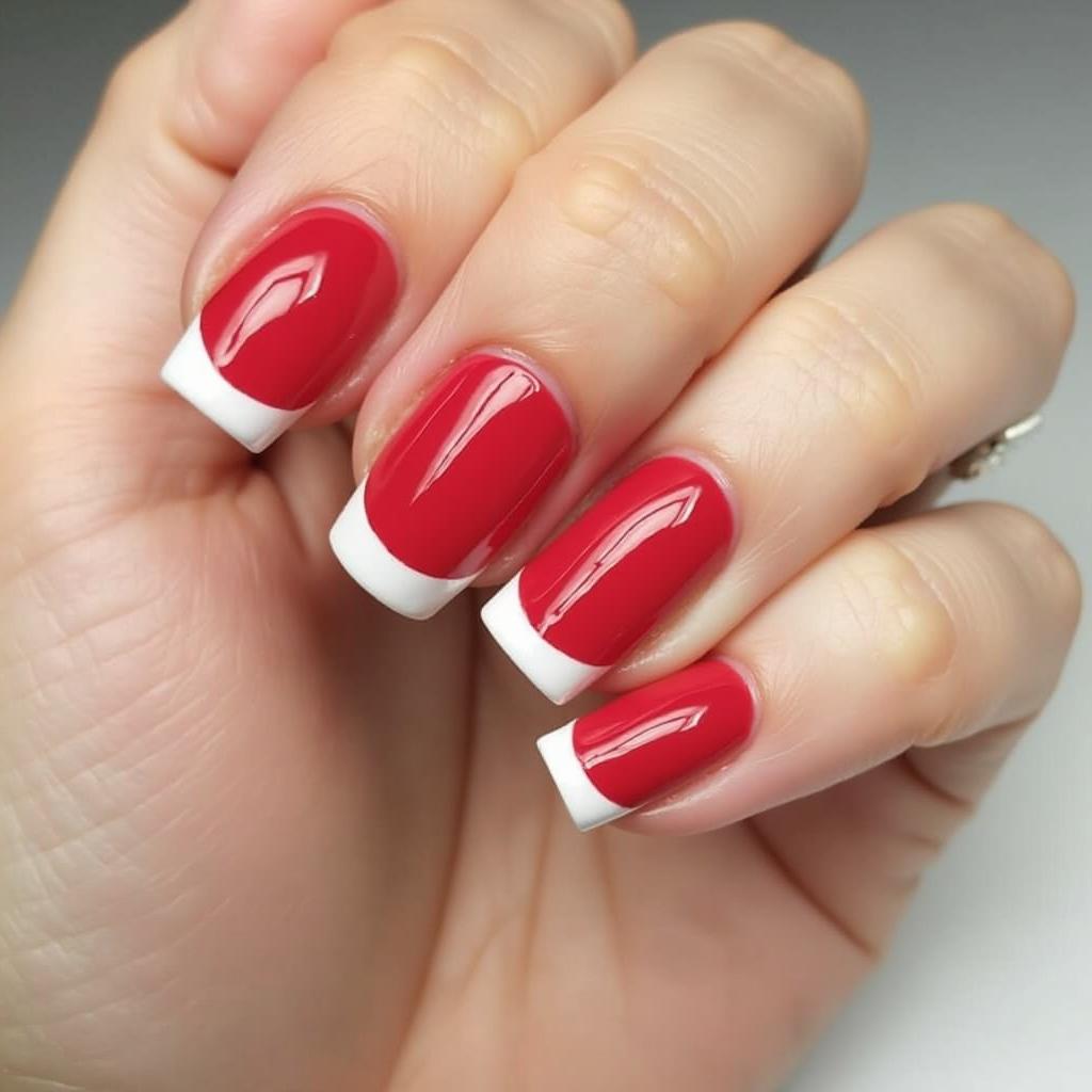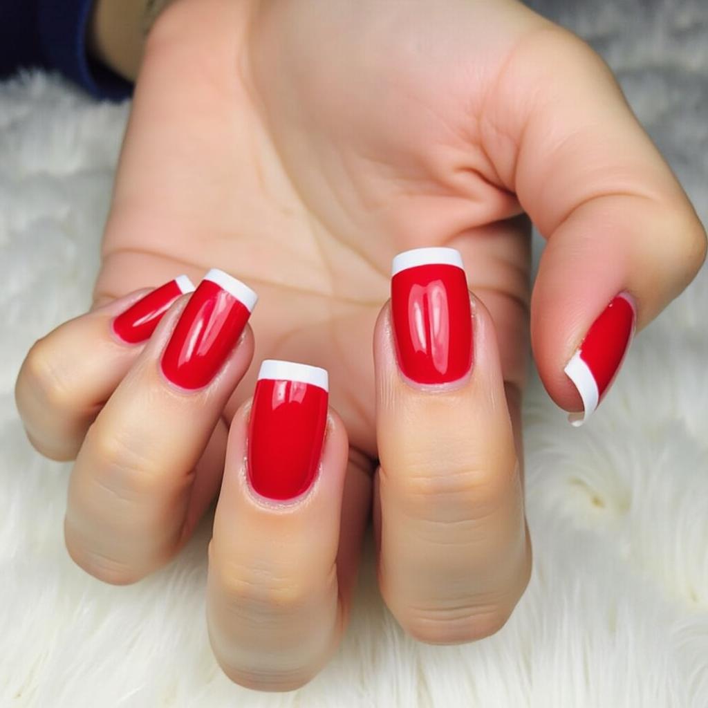Go for a classic red almond base with crisp white tips for a sleek, sophisticated design. This twist on the French tip style offers a simple, yet festive manicure that’s perfect for any holiday occasion.
