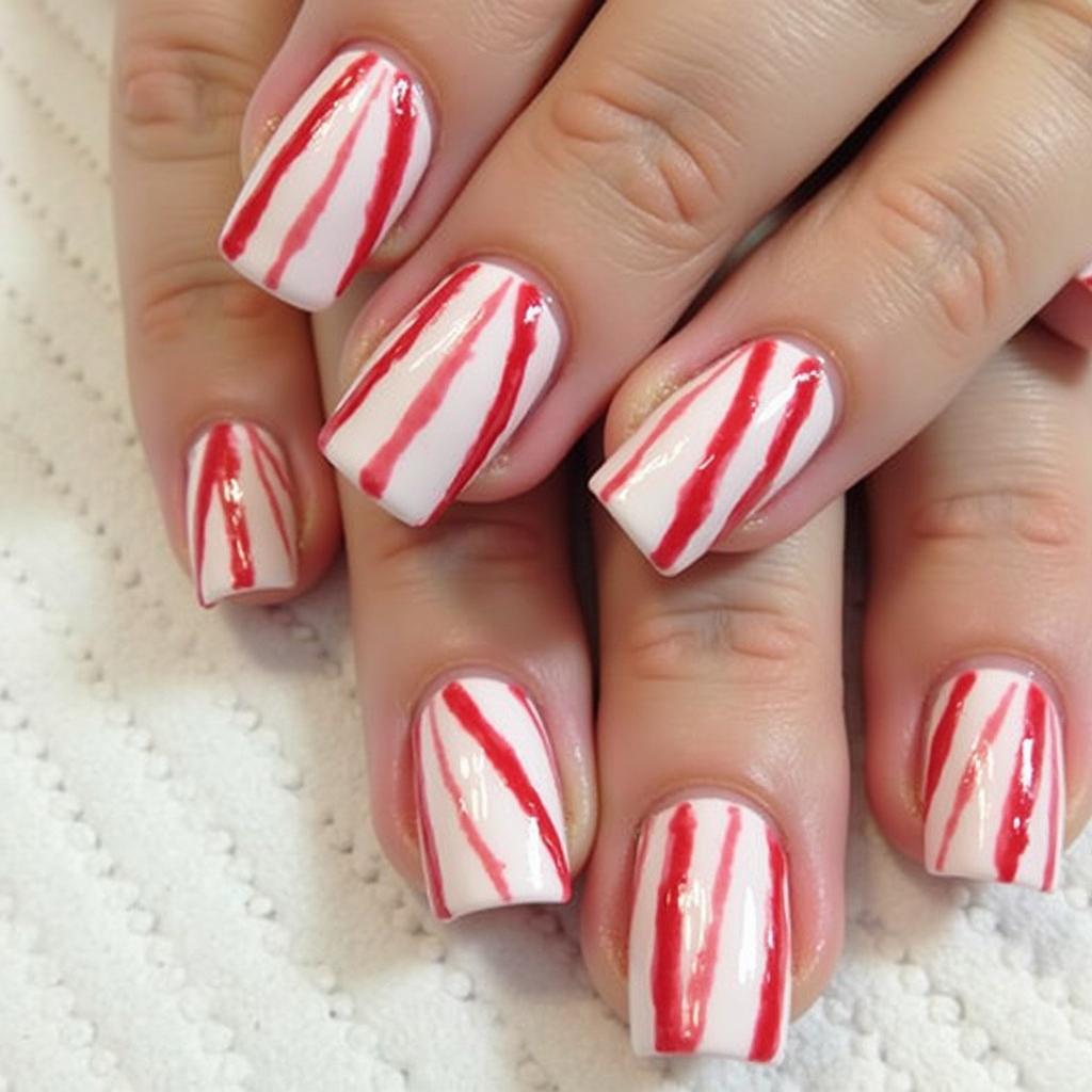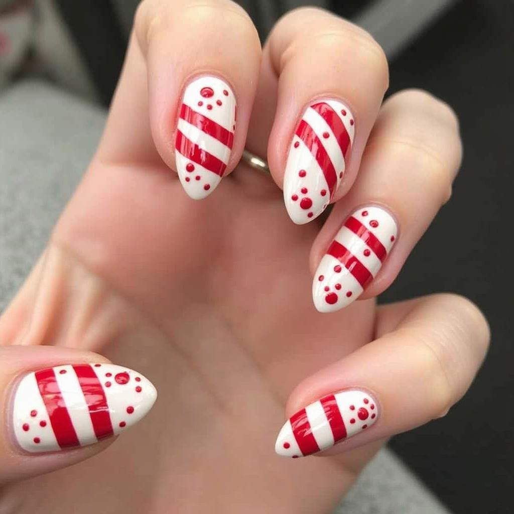 For a more playful yet elegant design, create subtle candy cane stripes on almond-shaped nails. Red and white stripes can be used sparingly on one or two nails, keeping the overall look chic and holiday-ready.