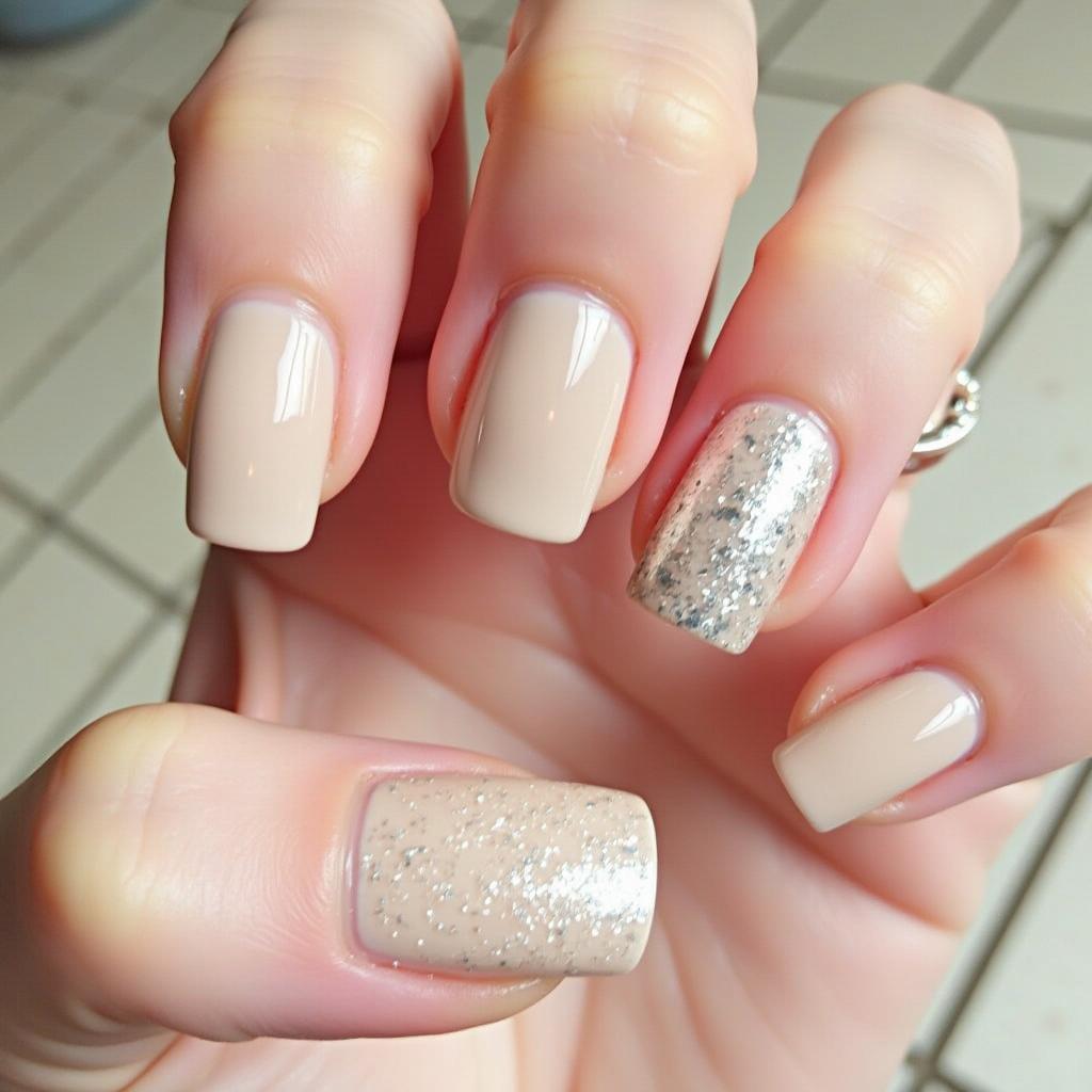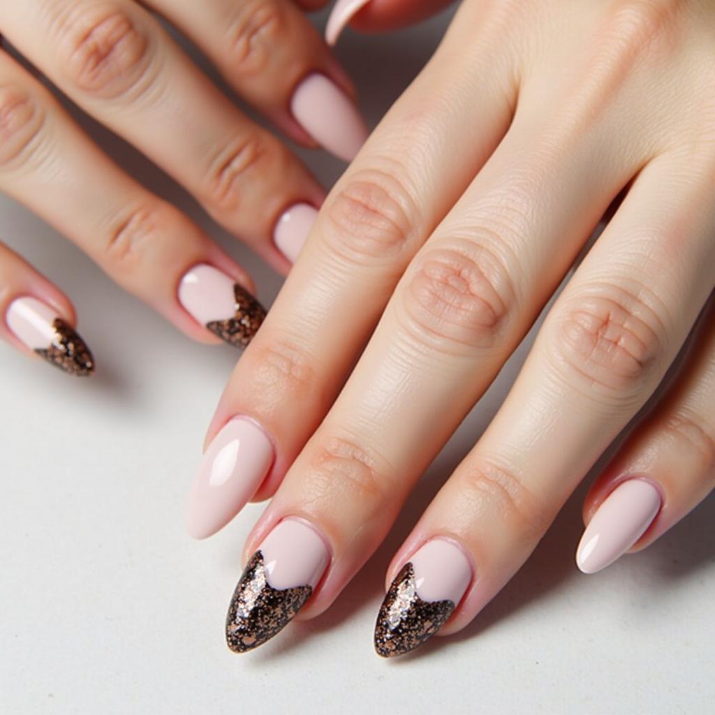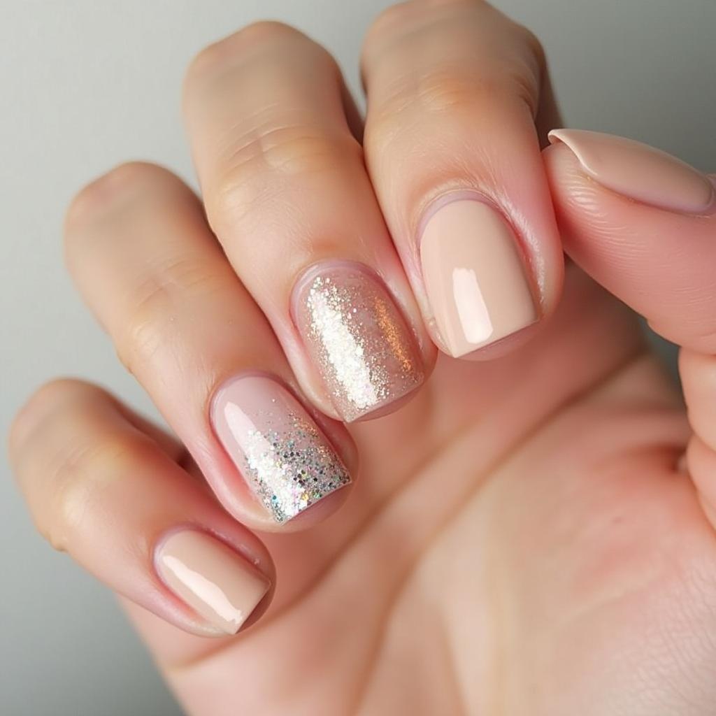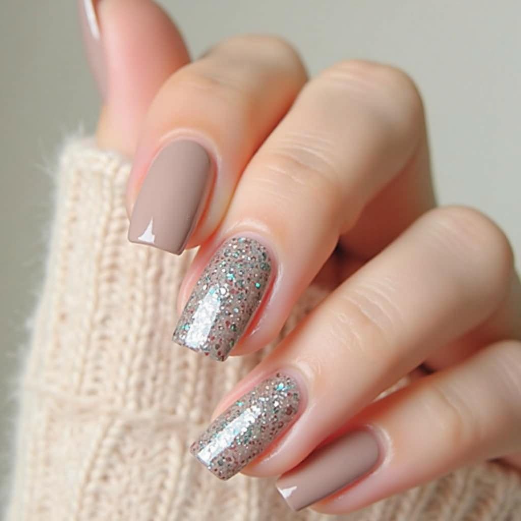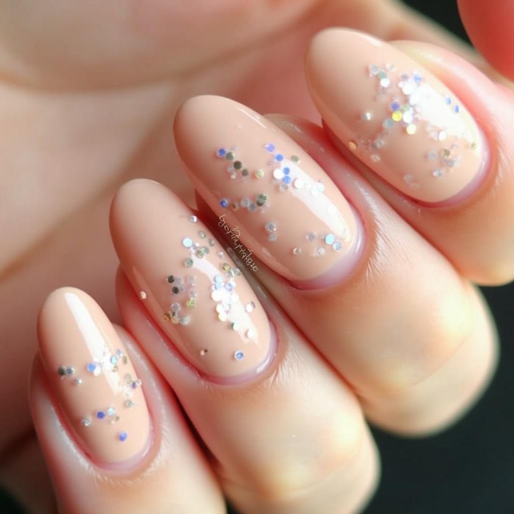 Champagne-colored almond nails with subtle glitter accents offer a sophisticated yet festive vibe. The soft, warm champagne tone complements any holiday outfit, while the glitter adds just the right amount of sparkle.