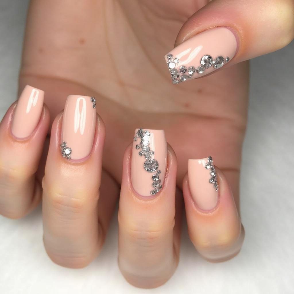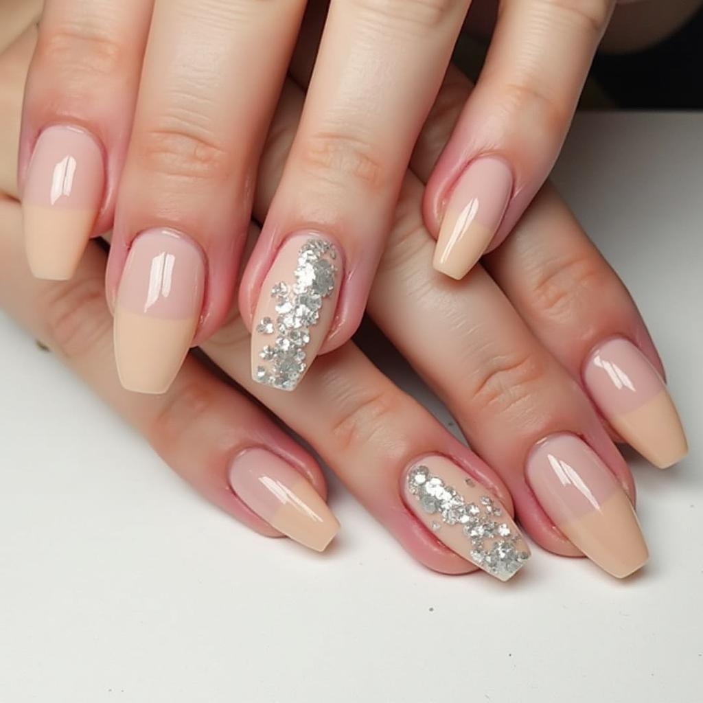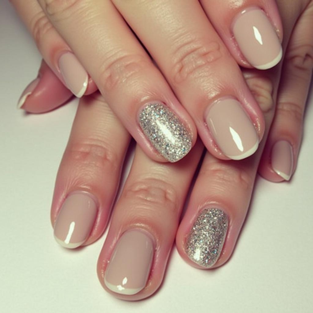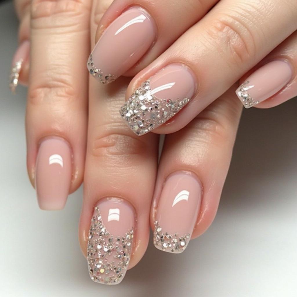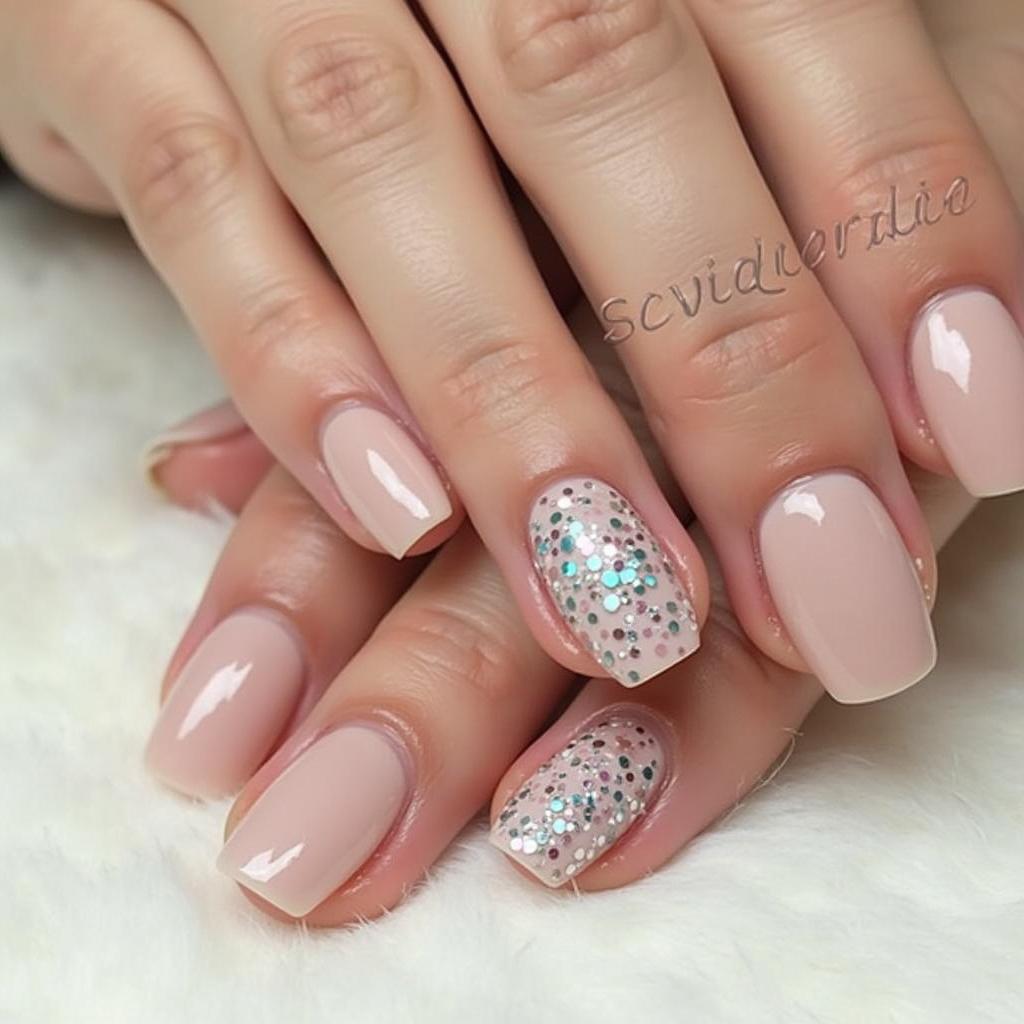Champagne-colored almond nails with subtle glitter accents offer a sophisticated yet festive vibe. The soft, warm champagne tone complements any holiday outfit, while the glitter adds just the right amount of sparkle.