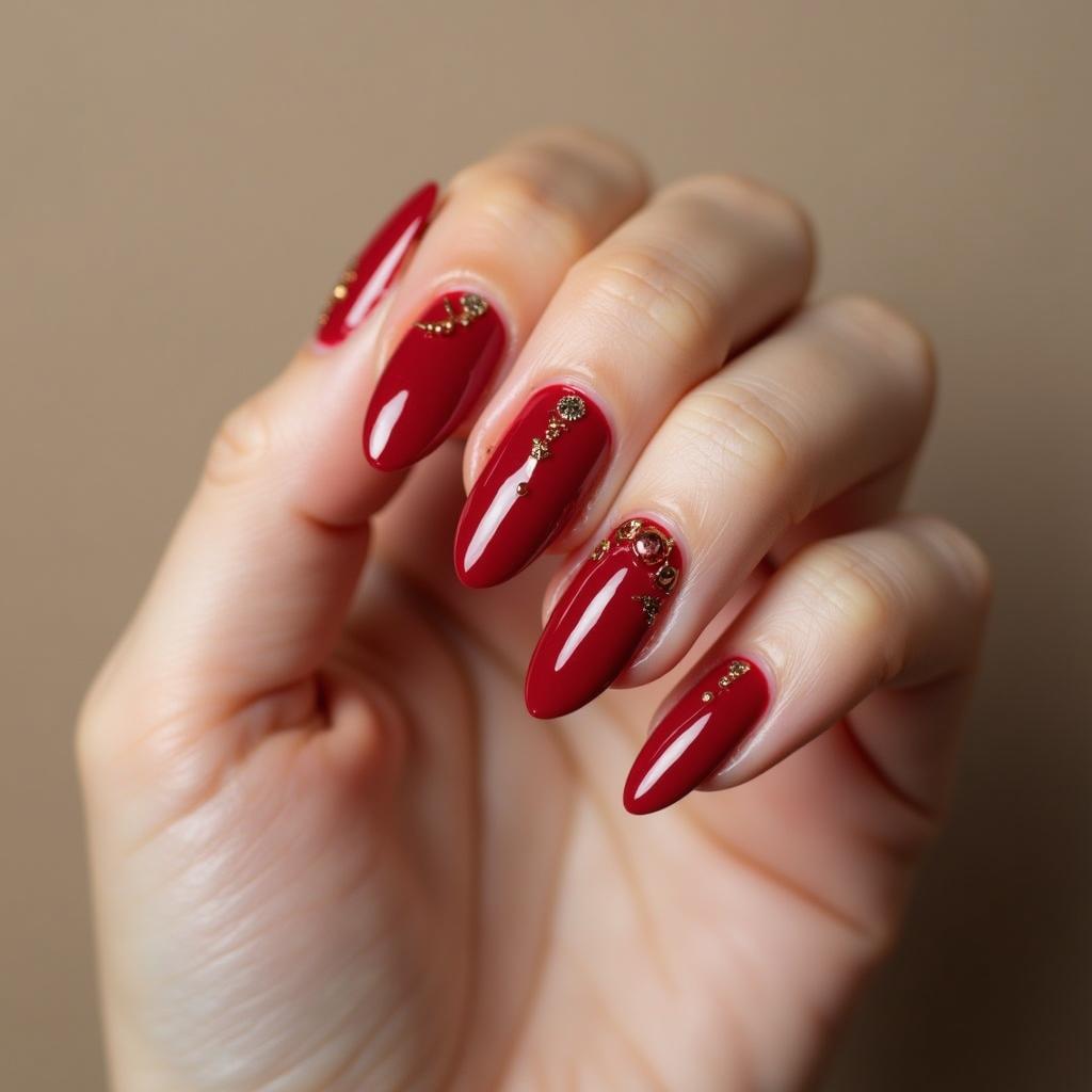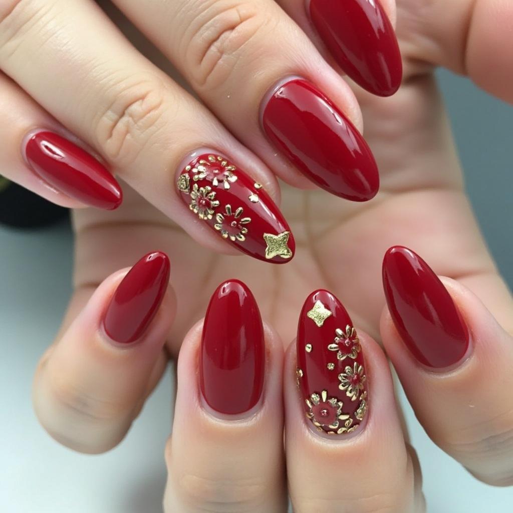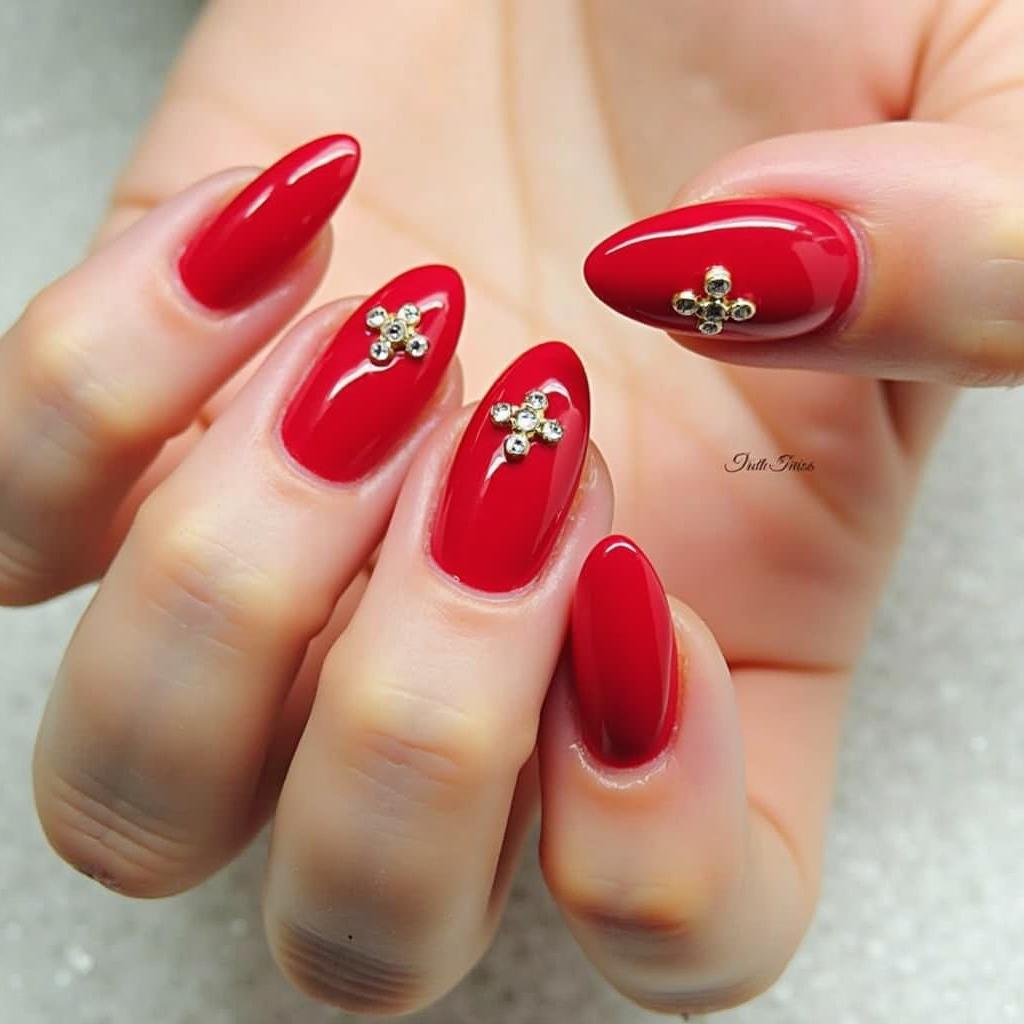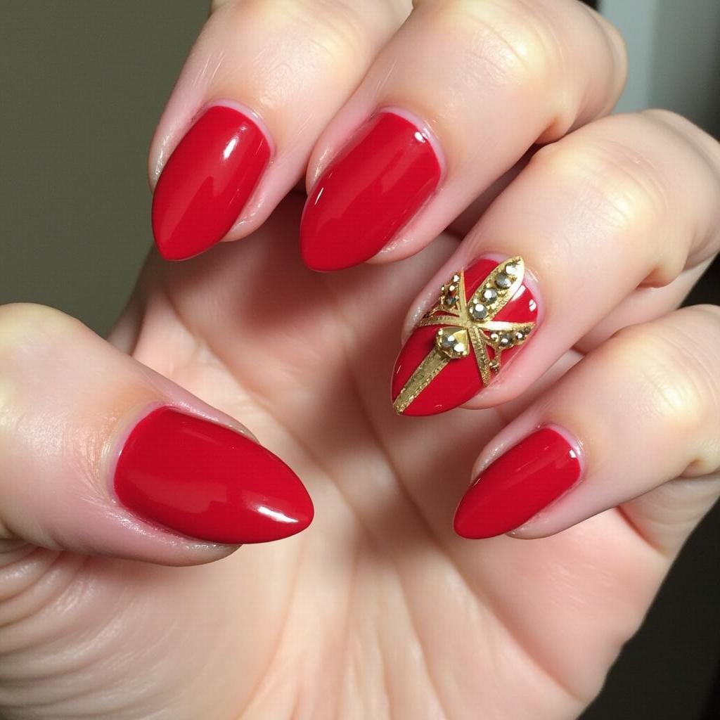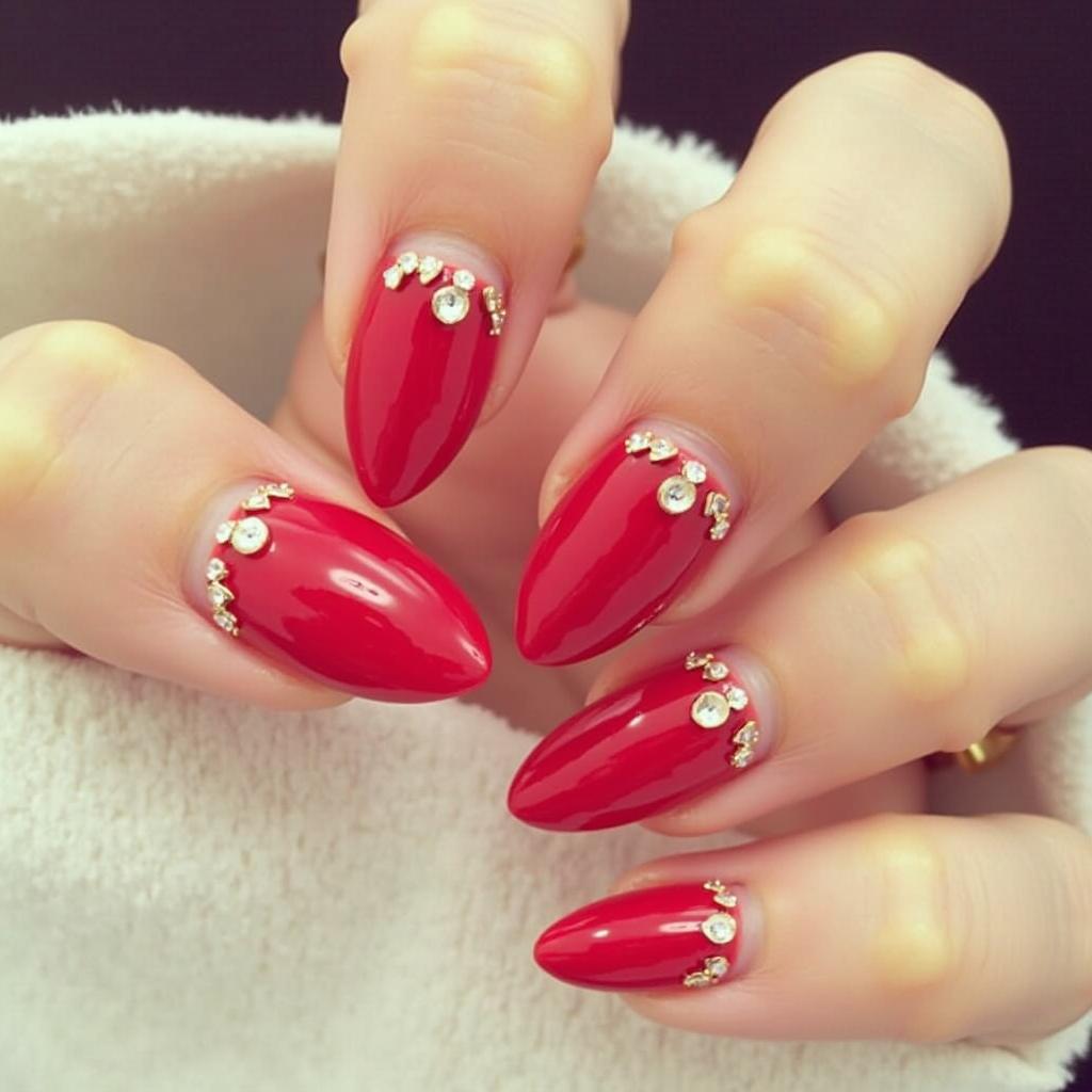 For a glamorous holiday look, pair red almond nails with gold rhinestone accents. The rhinestones catch the light and add a touch of luxury, making your nails shine like holiday decorations.