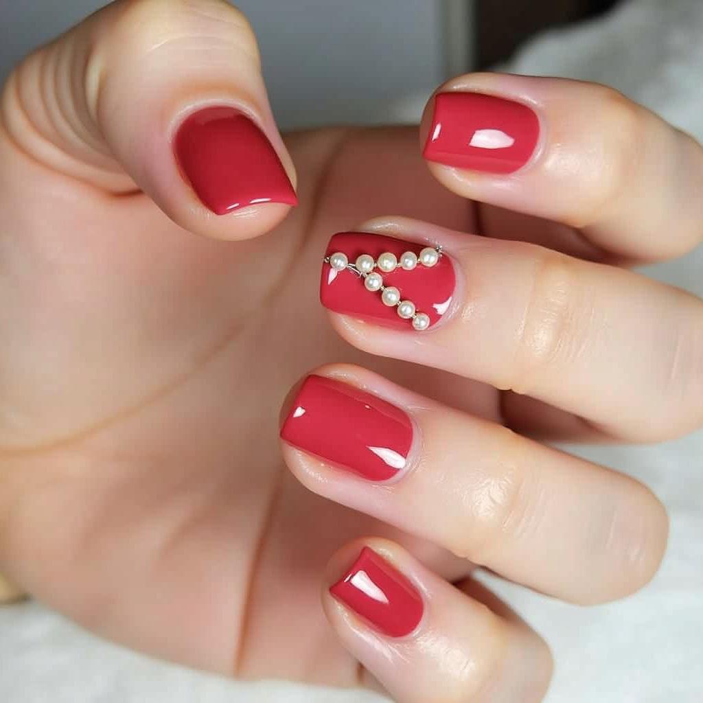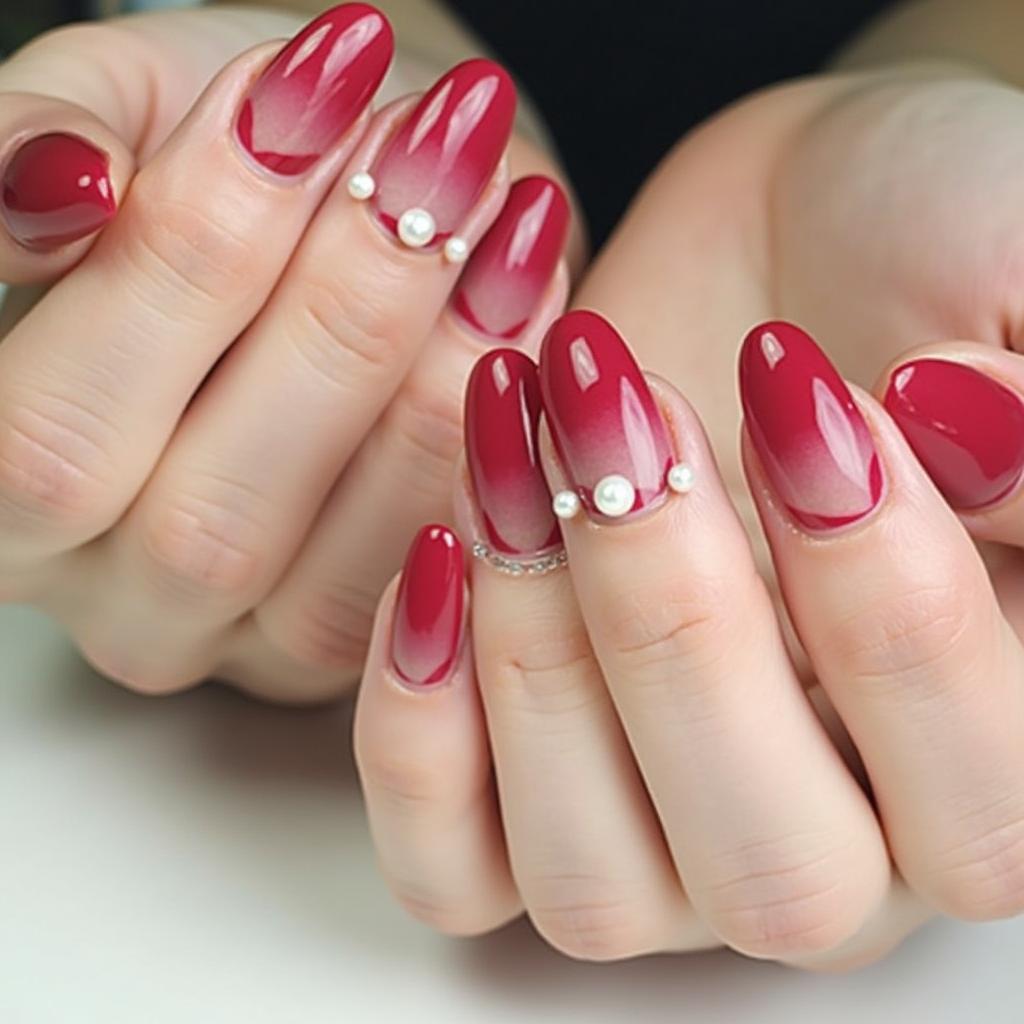 Deep red almond nails with a pearl accent on each nail create a luxurious, elegant holiday look. The pearls bring texture and class, making these nails the perfect accessory for a chic Christmas celebration.