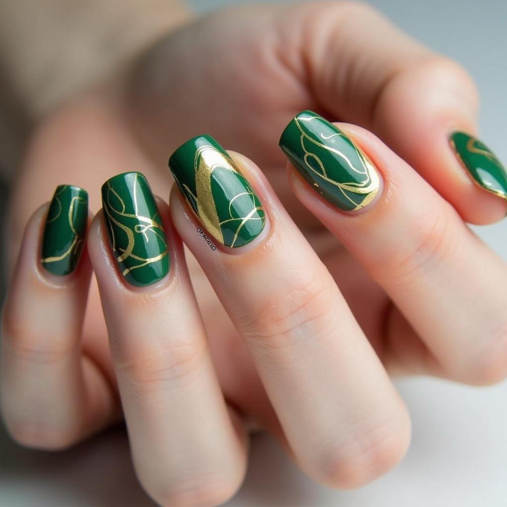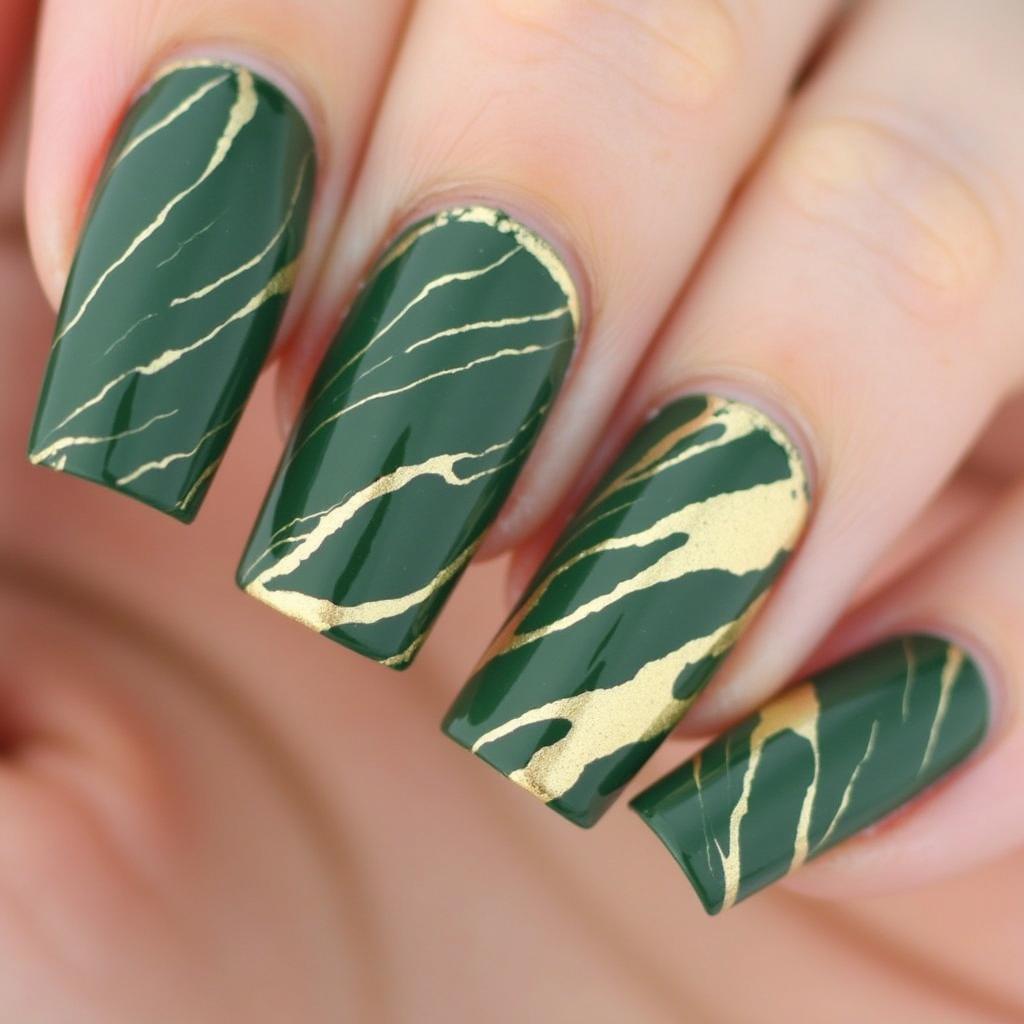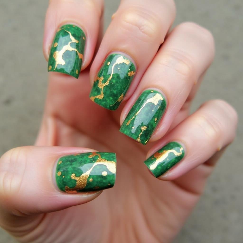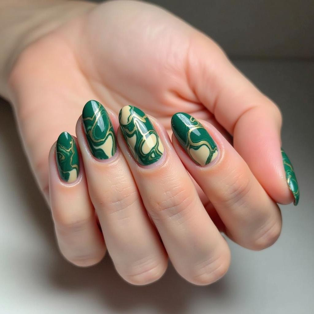 Green and gold marble nails offer a sophisticated twist on the traditional Christmas color palette. The fluid marble design paired with gold accents provides an elegant, artistic style for your almond nails.