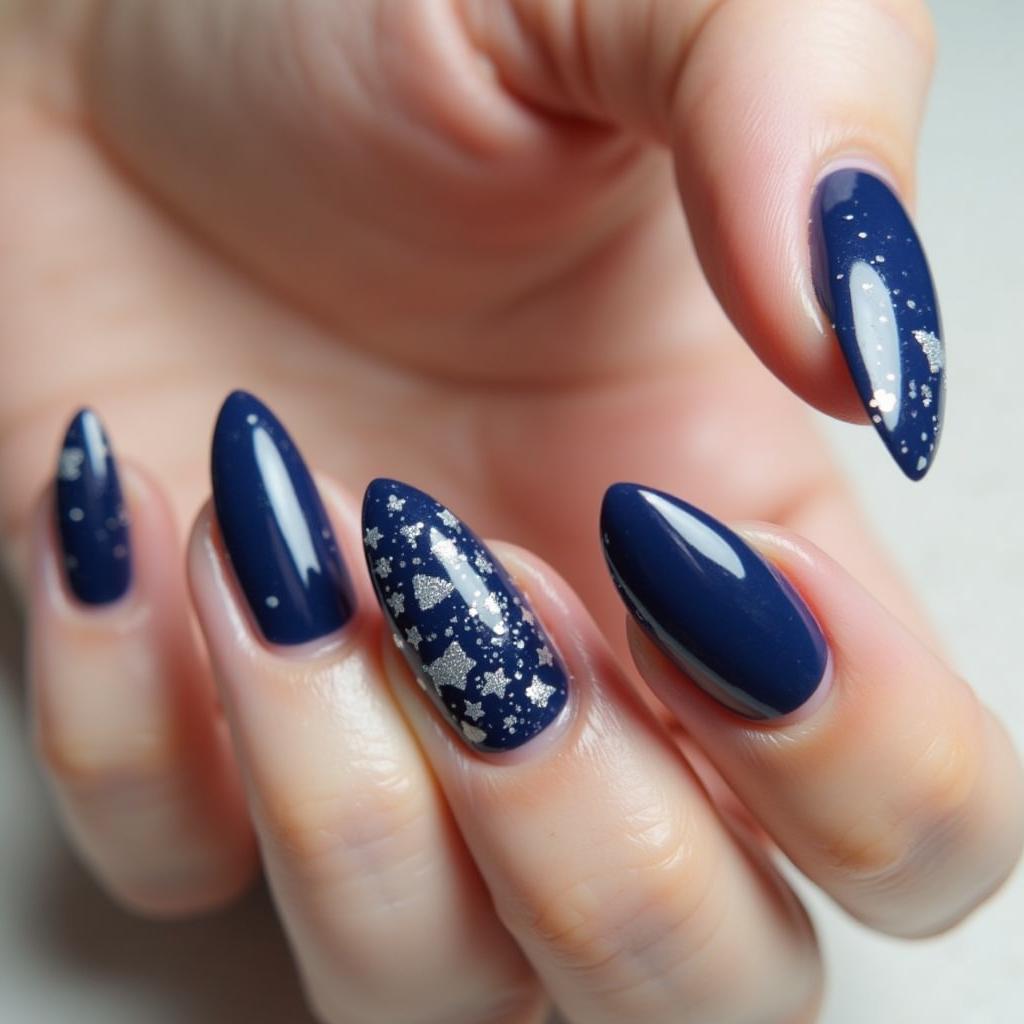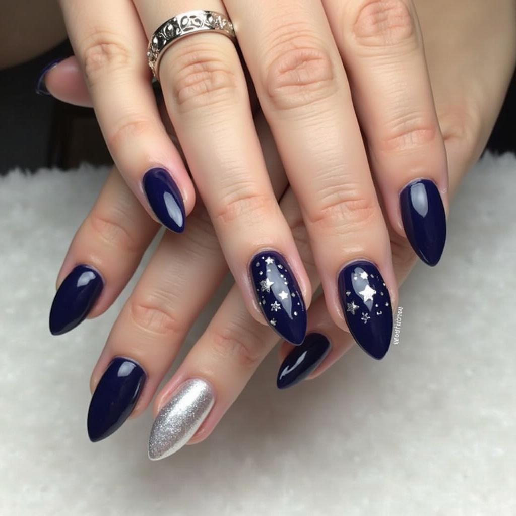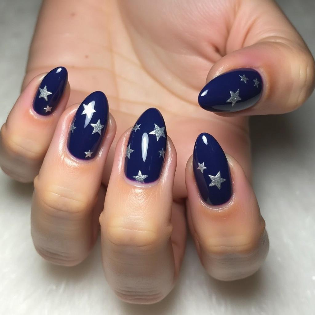 Navy blue almond nails with tiny silver stars create a magical, starry design perfect for the season. This deep, rich color paired with sparkling stars offers an elegant, celestial vibe that’s ideal for the holidays.