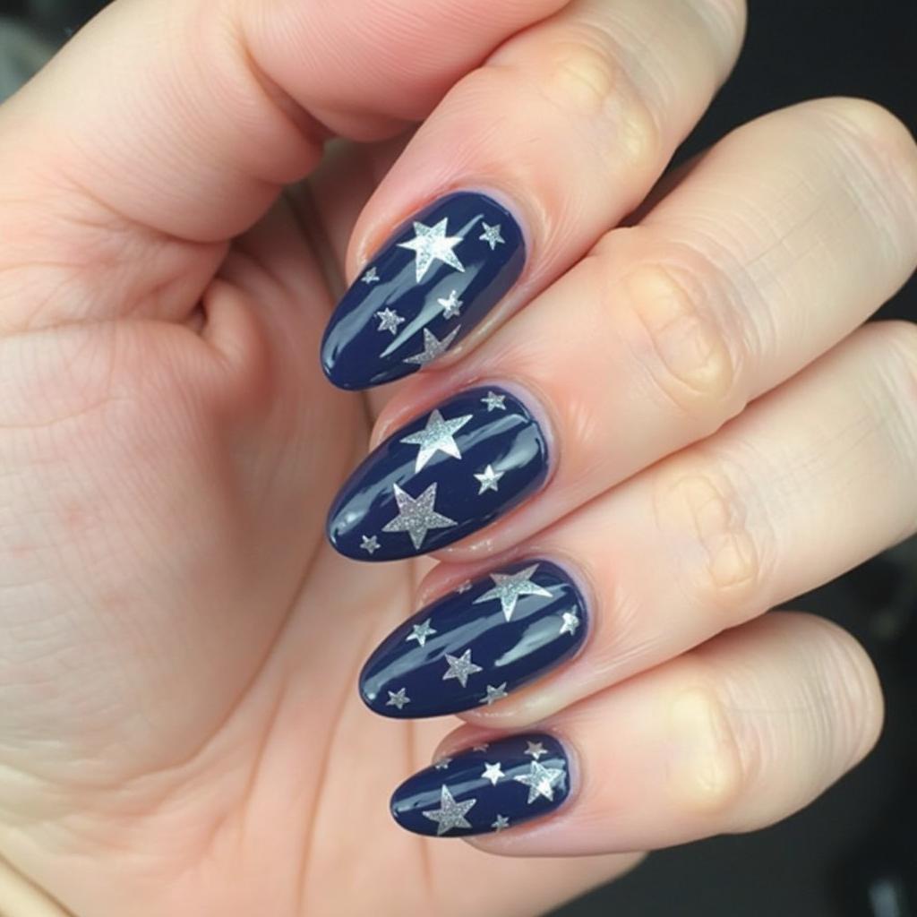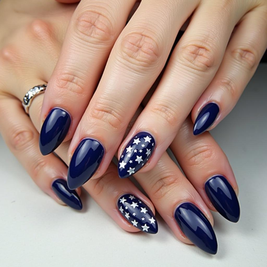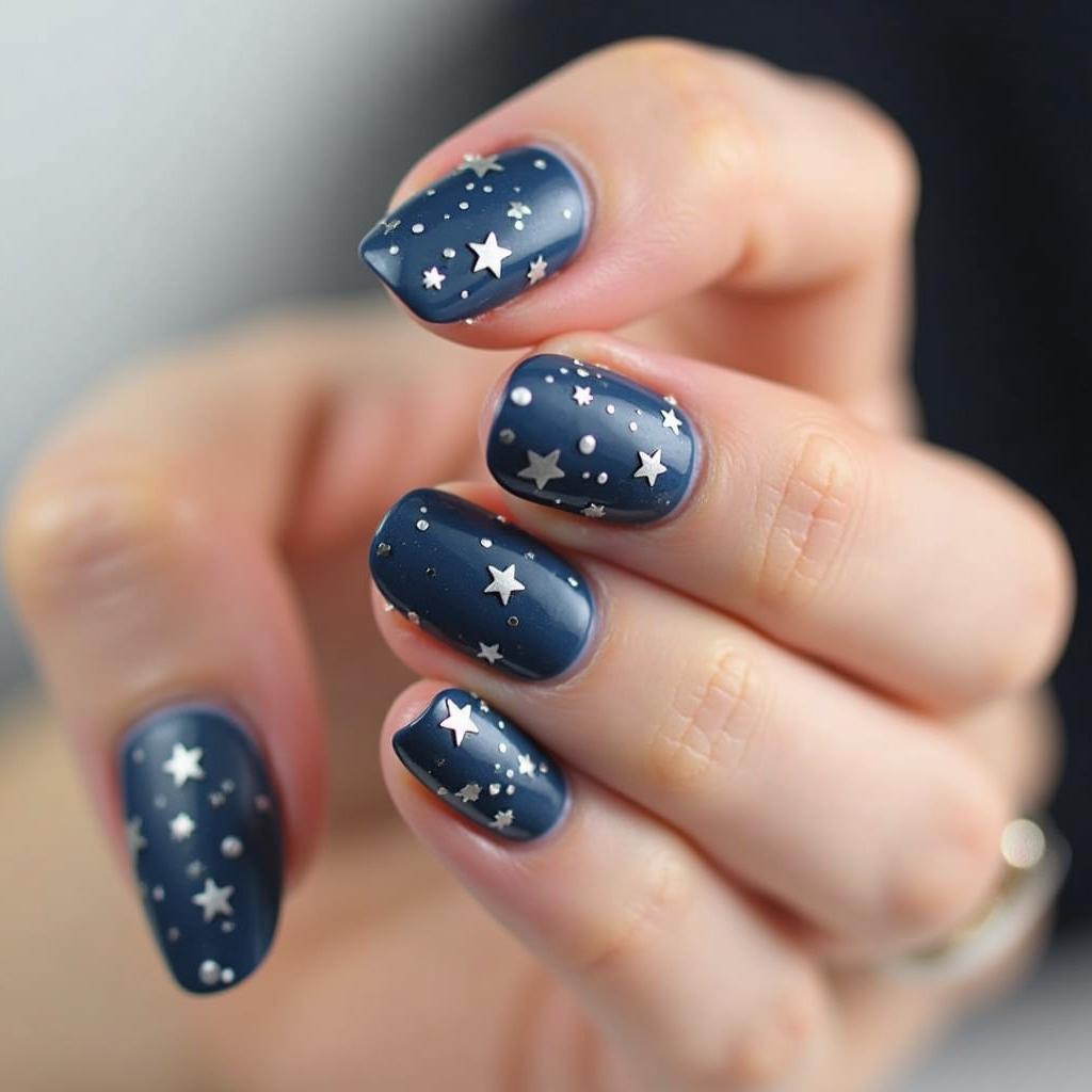 Navy blue almond nails with tiny silver stars create a magical, starry design perfect for the season. This deep, rich color paired with sparkling stars offers an elegant, celestial vibe that’s ideal for the holidays.