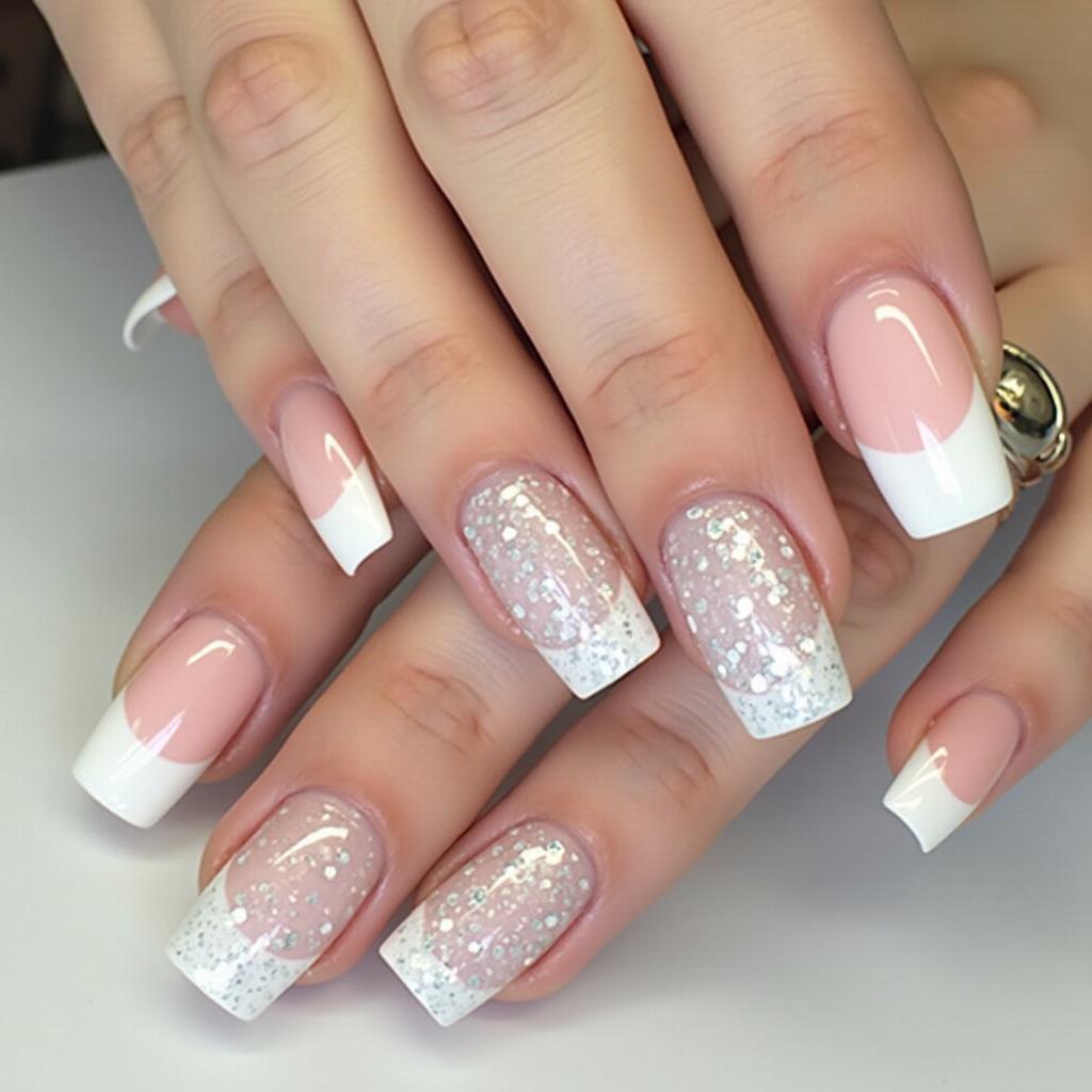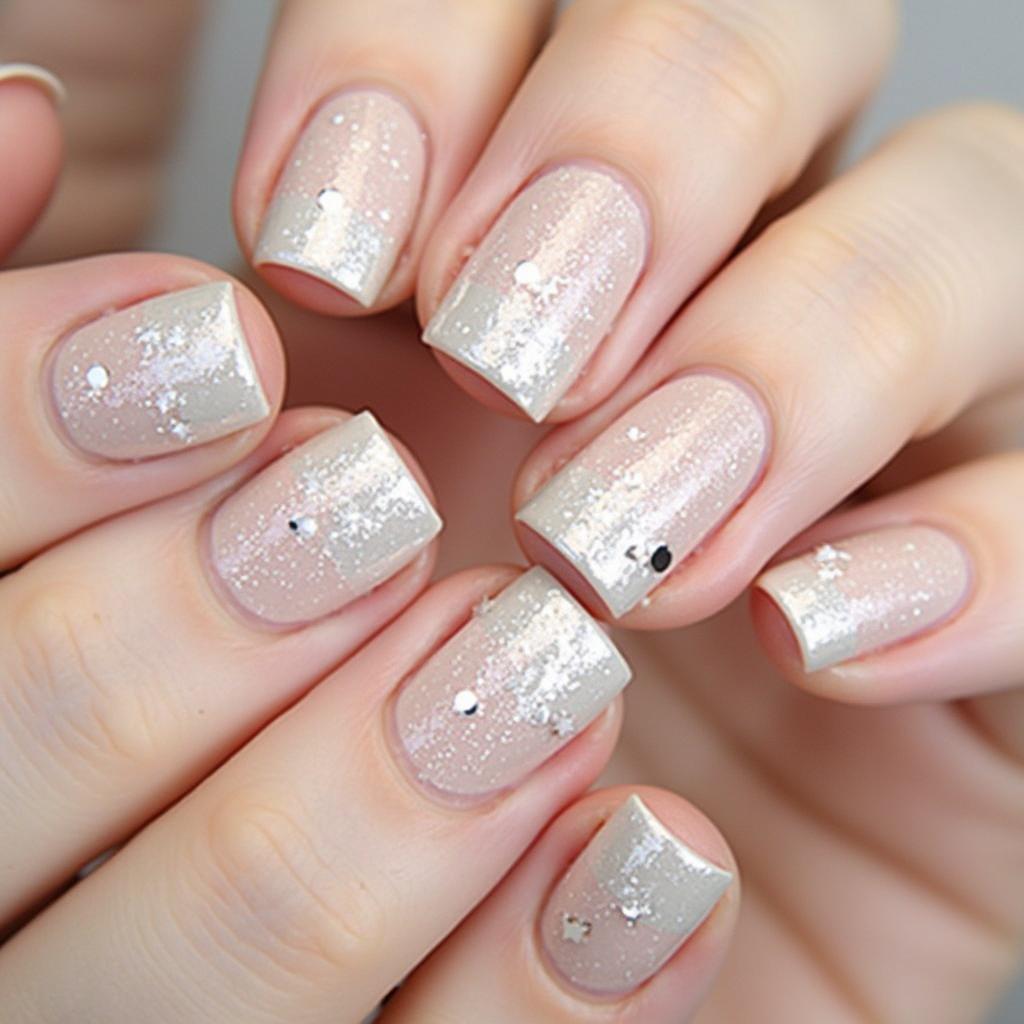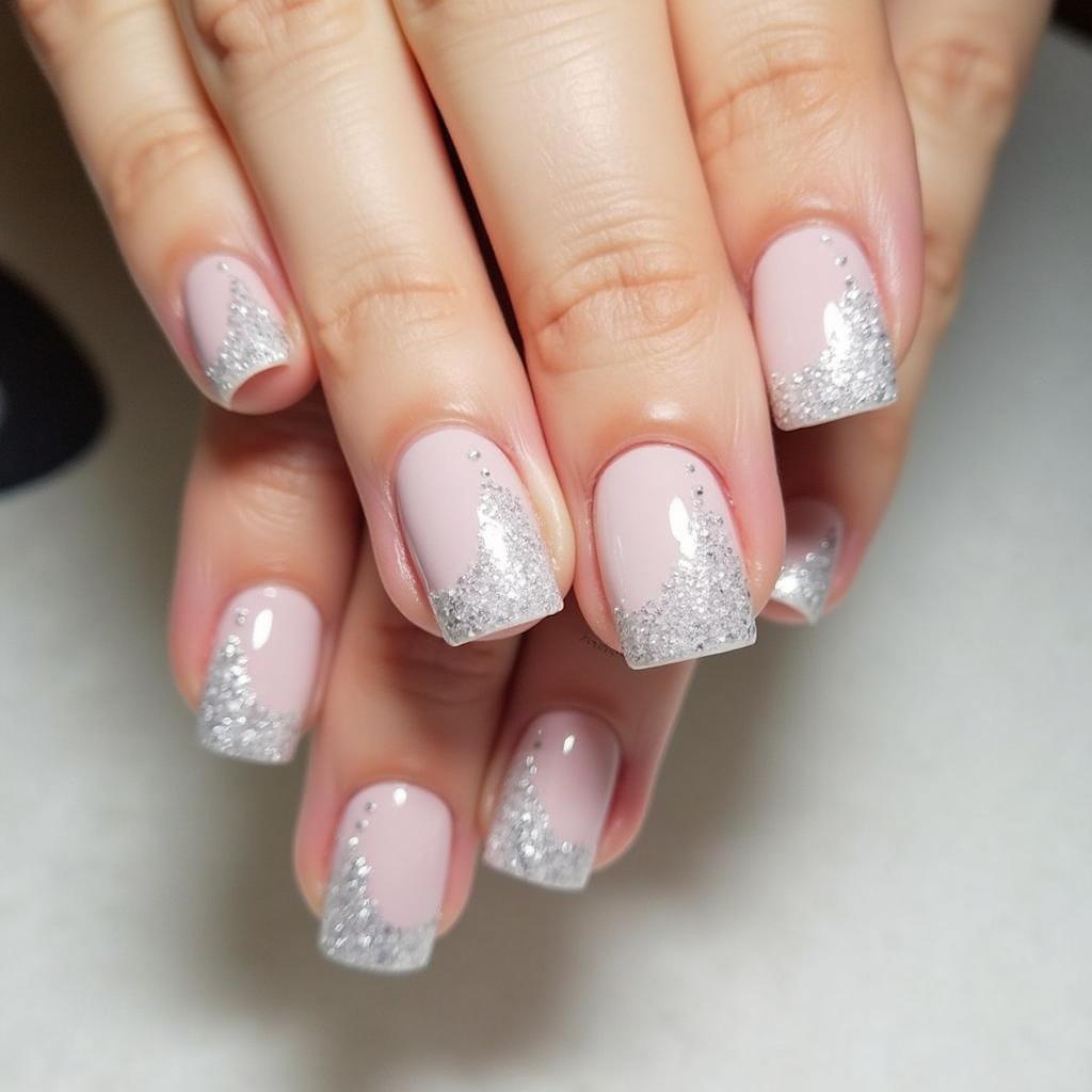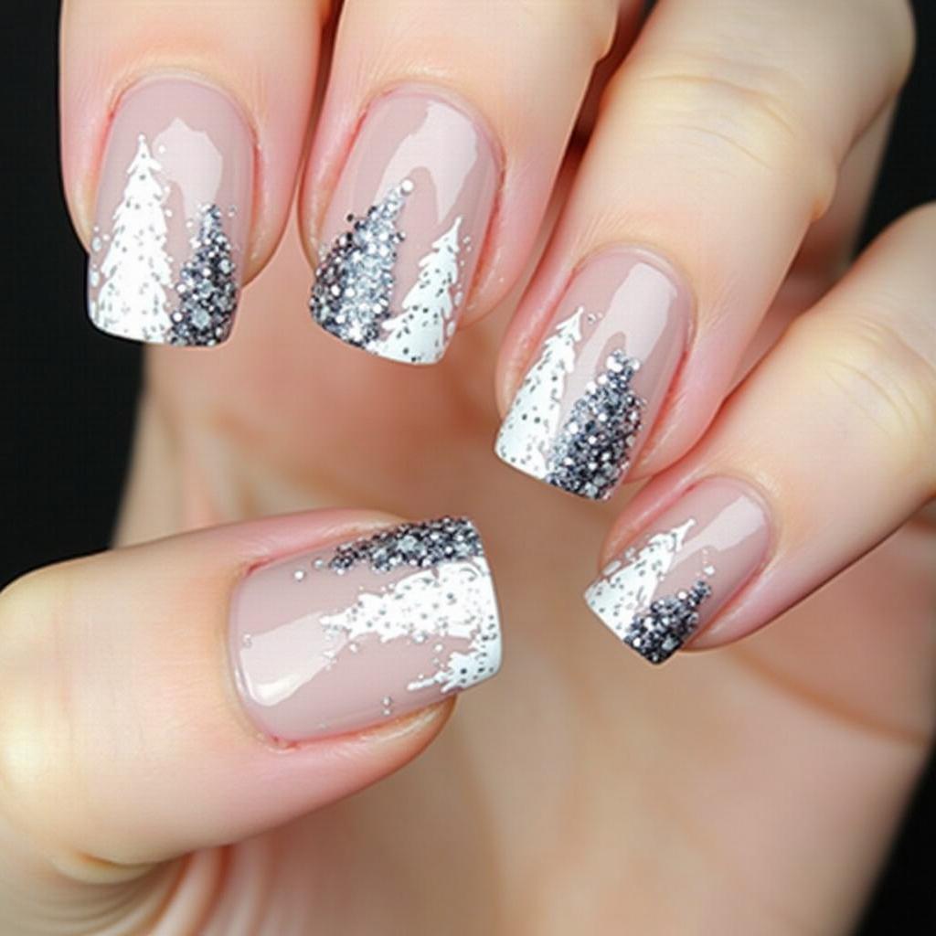 A frosted white almond base with silver glitter accents or tips gives a frosty, wintry look. The silver glitter sparkles beautifully, making these nails perfect for a glamorous holiday appearance.