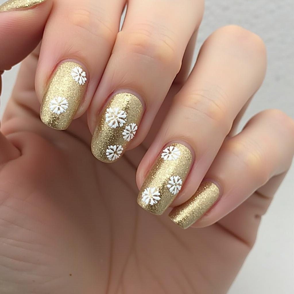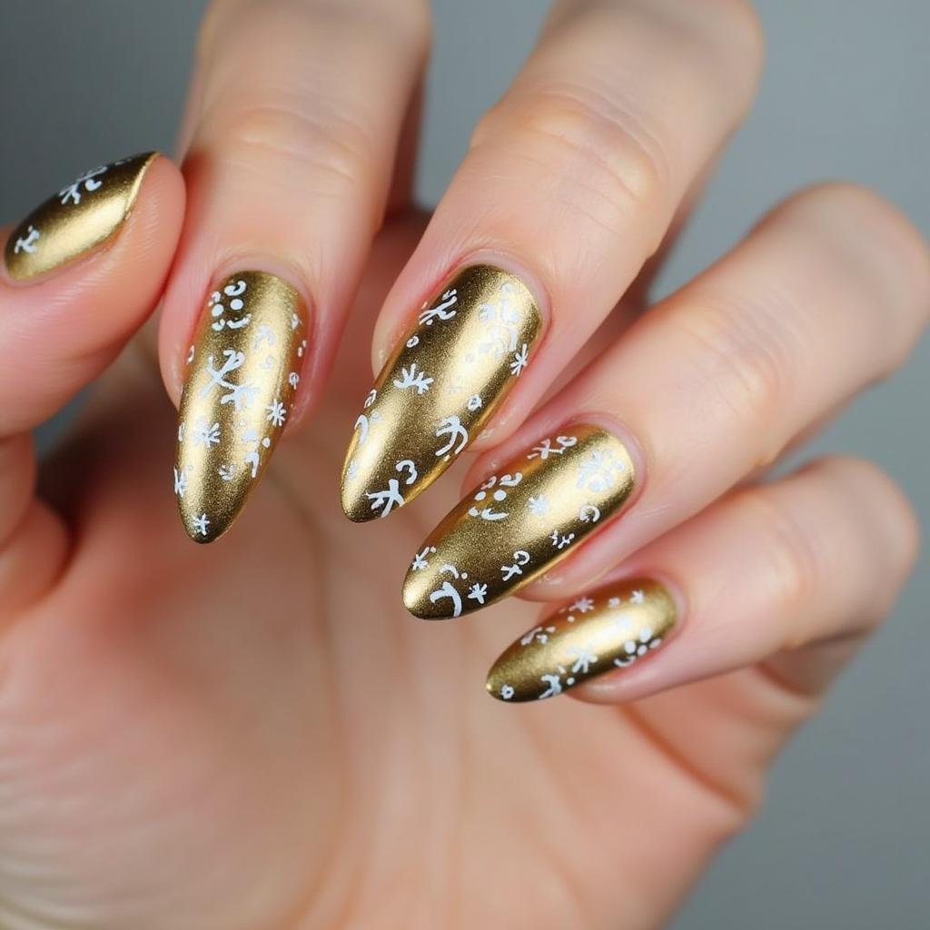 Metallic gold almond nails paired with delicate white snowflakes bring a luxurious, wintery feel to your holiday manicure. The gold offers a rich, shiny base, while the snowflakes add a festive and cool contrast.