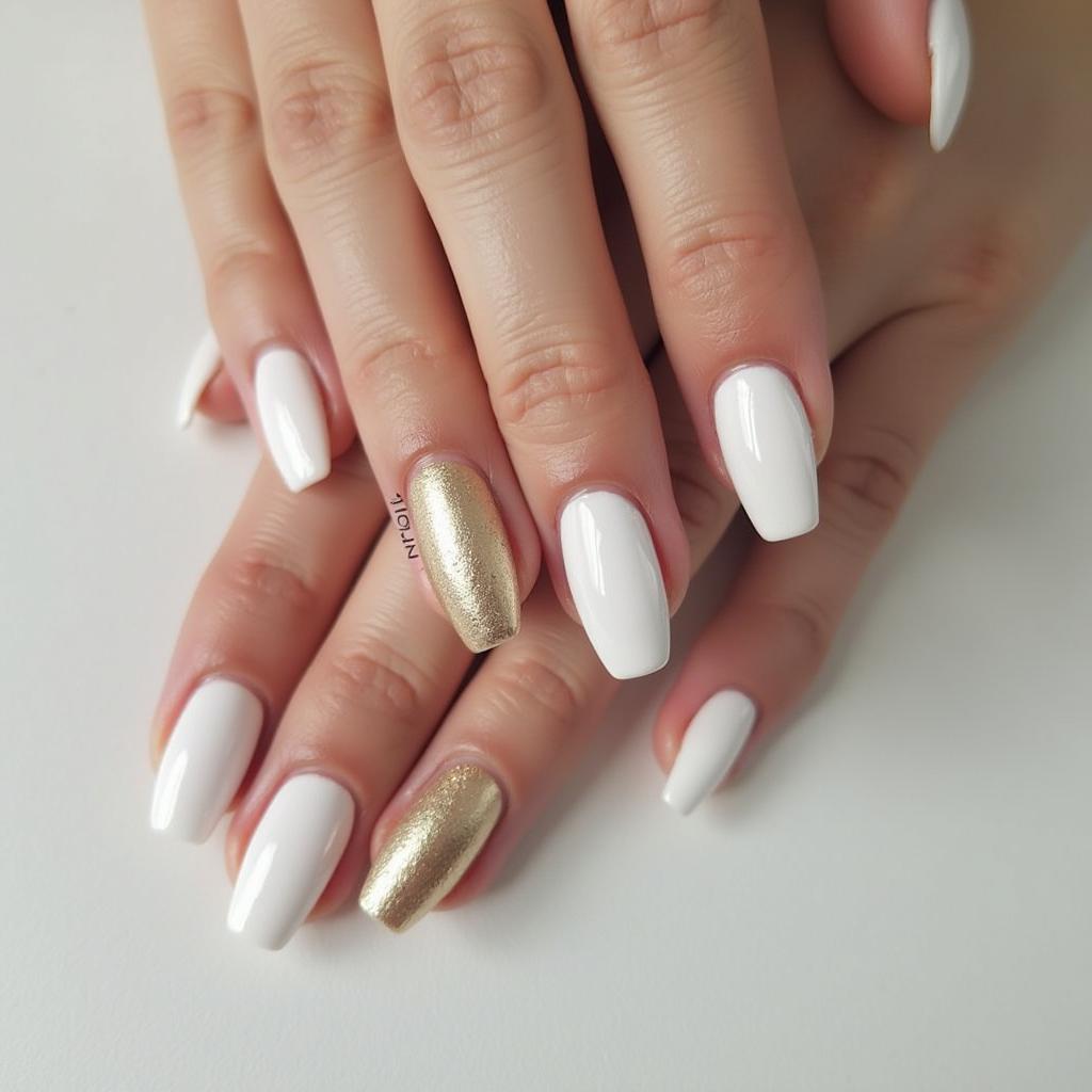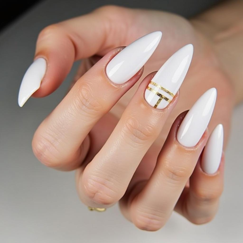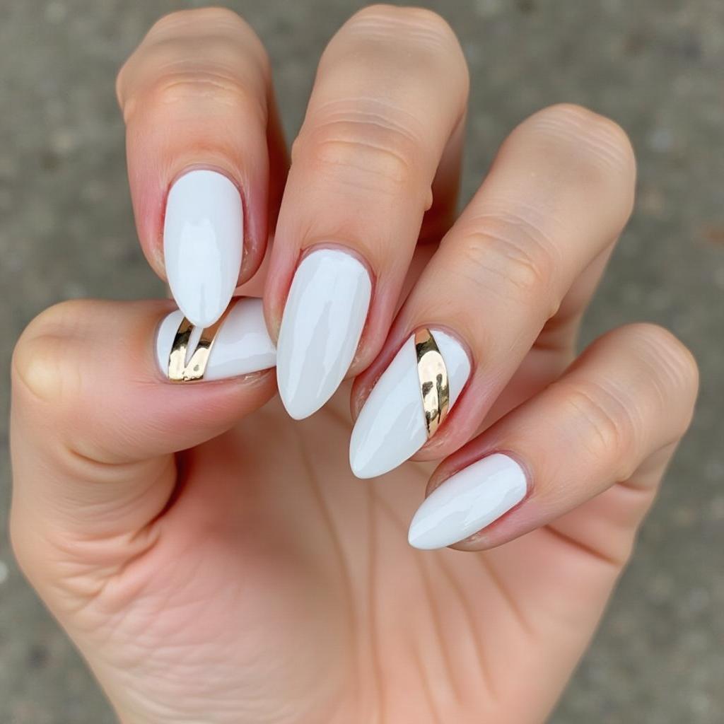 White almond nails with a touch of gold foil offer a minimalist yet modern holiday look. The gold foil adds a touch of festivity without overwhelming the sleek design of the almond shape.