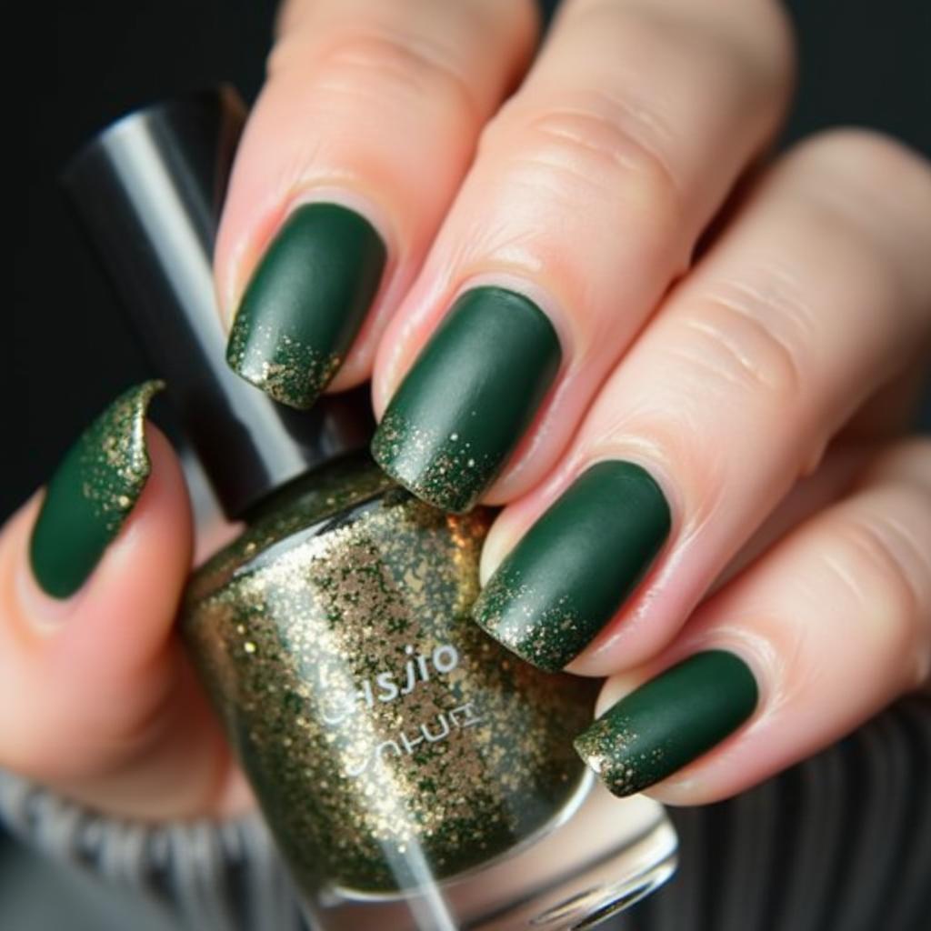 For a more modern take on Christmas nails, go for matte green almond nails with gold glitter tips or an accent nail with gold foil. The matte finish adds sophistication, while the gold glitter elevates the design with a touch of luxury.