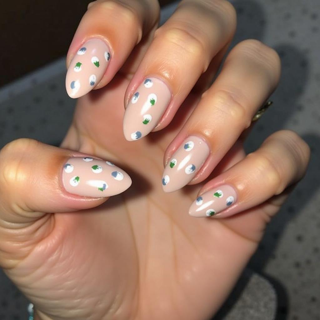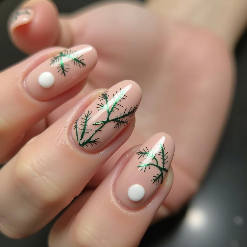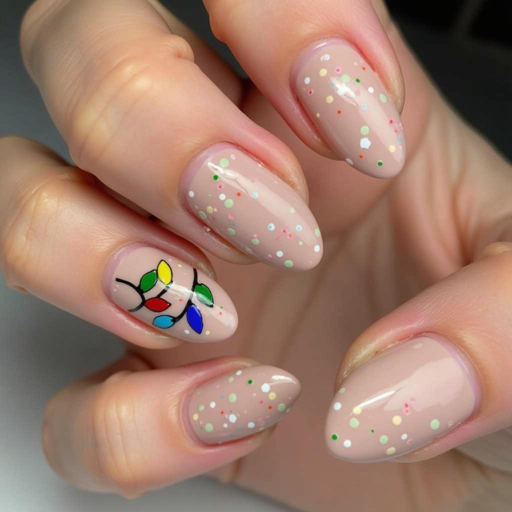 Nude almond nails with tiny Christmas light designs offer a fun yet elegant look. The soft nude base keeps the design sleek, while the colorful lights add a whimsical, festive touch that’s still sophisticated.