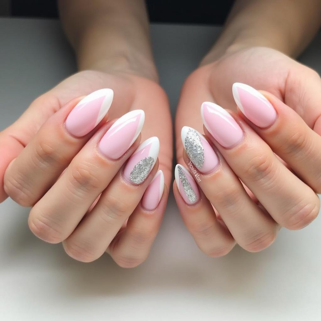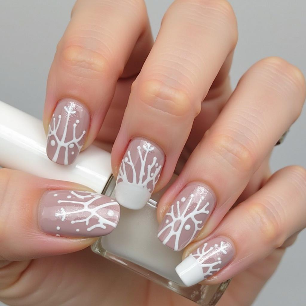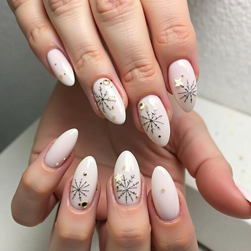 For those who prefer a lighter, more subtle holiday look, soft pink almond nails with white accents and delicate silver detailing offer an elegant yet festive design perfect for the season.