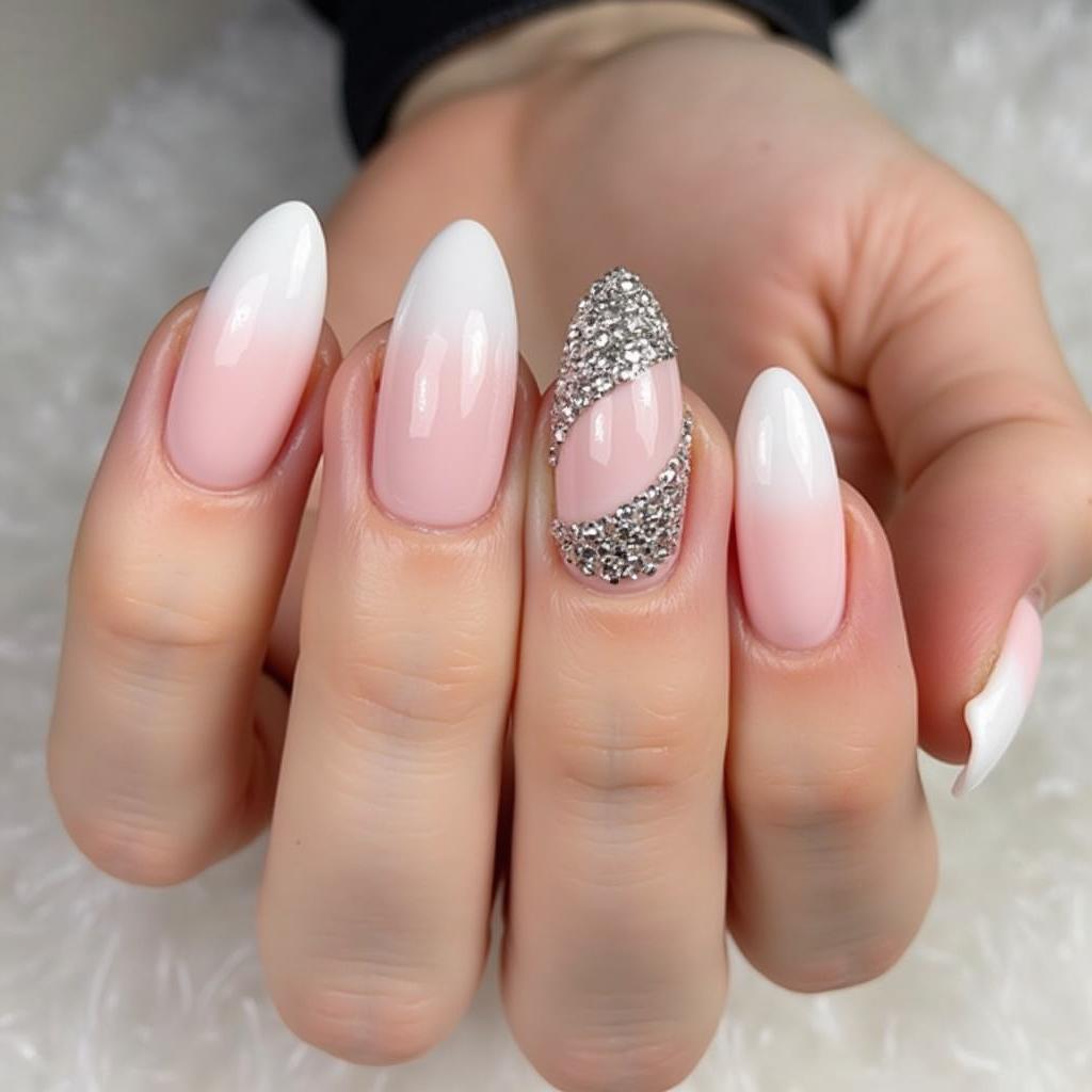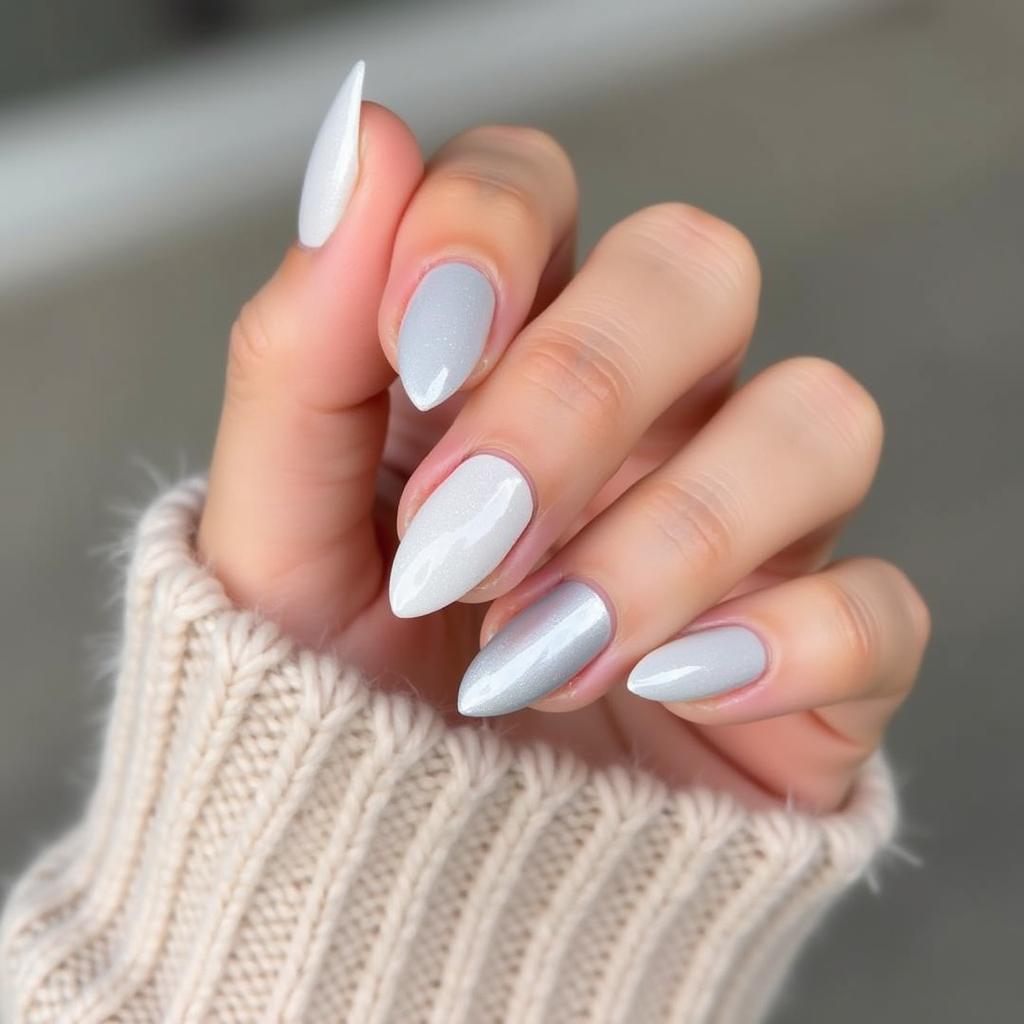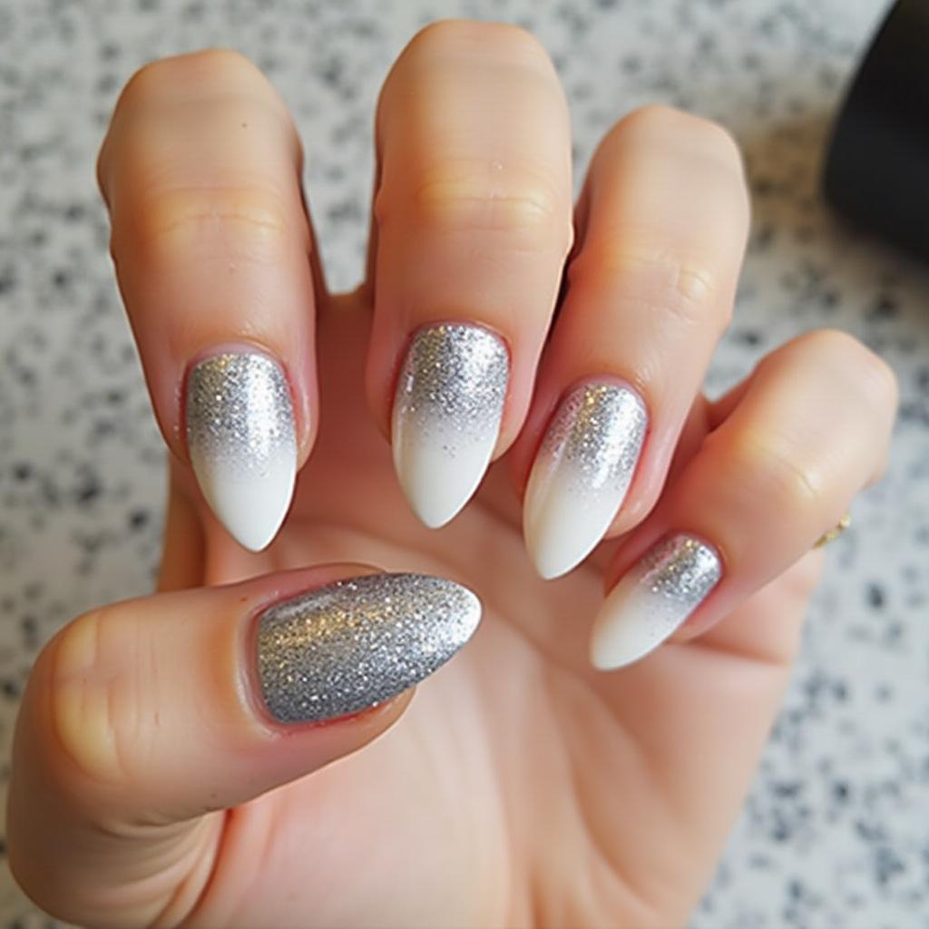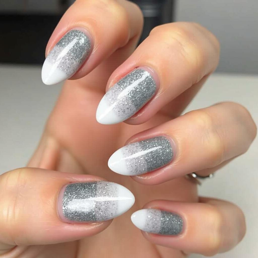 Silver ombre almond nails, fading from white to silver, create a sleek, glamorous look. The ombre effect adds dimension, while the silver makes the design sparkle, perfect for the festive season.