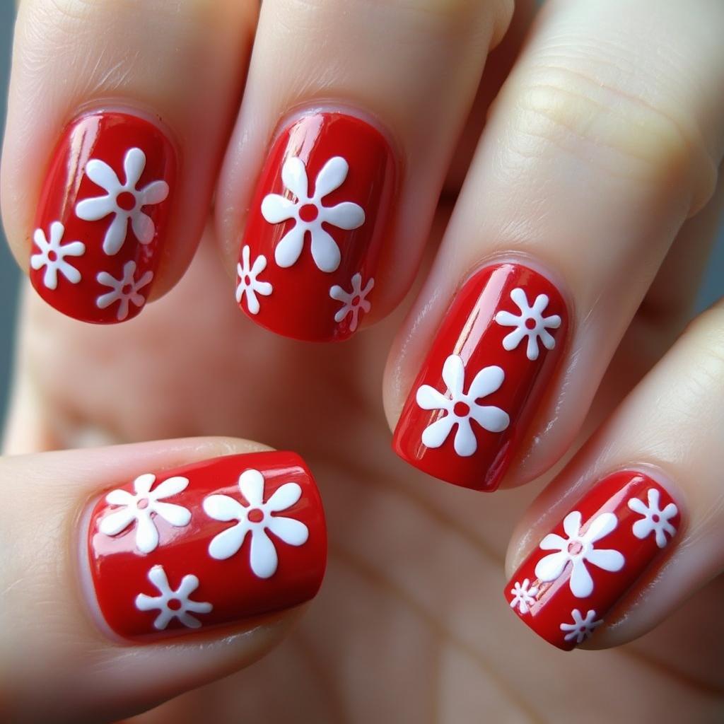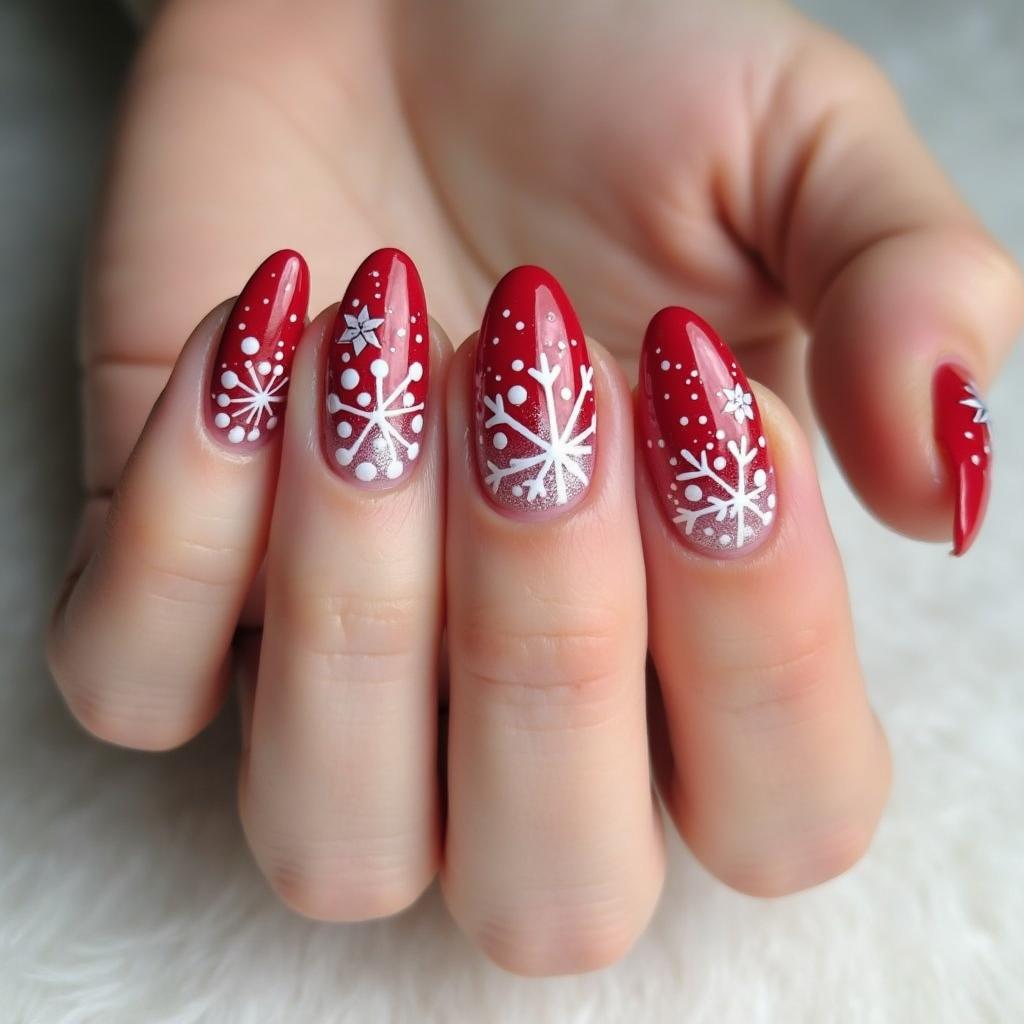 A beautiful, snowy design on red almond nails featuring small white snowflakes brings a serene winter vibe to your holiday look. The soft contrast between the red and white is simple yet enchanting.