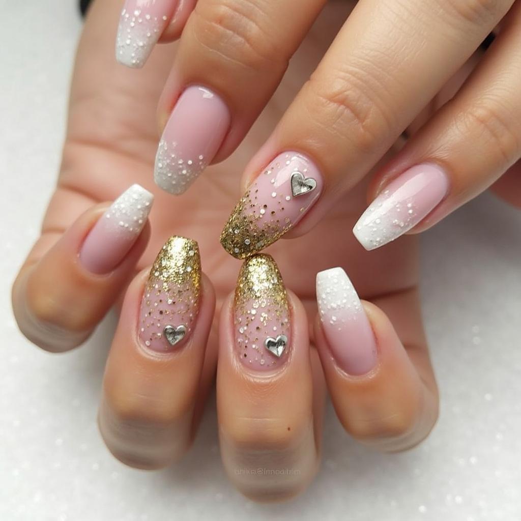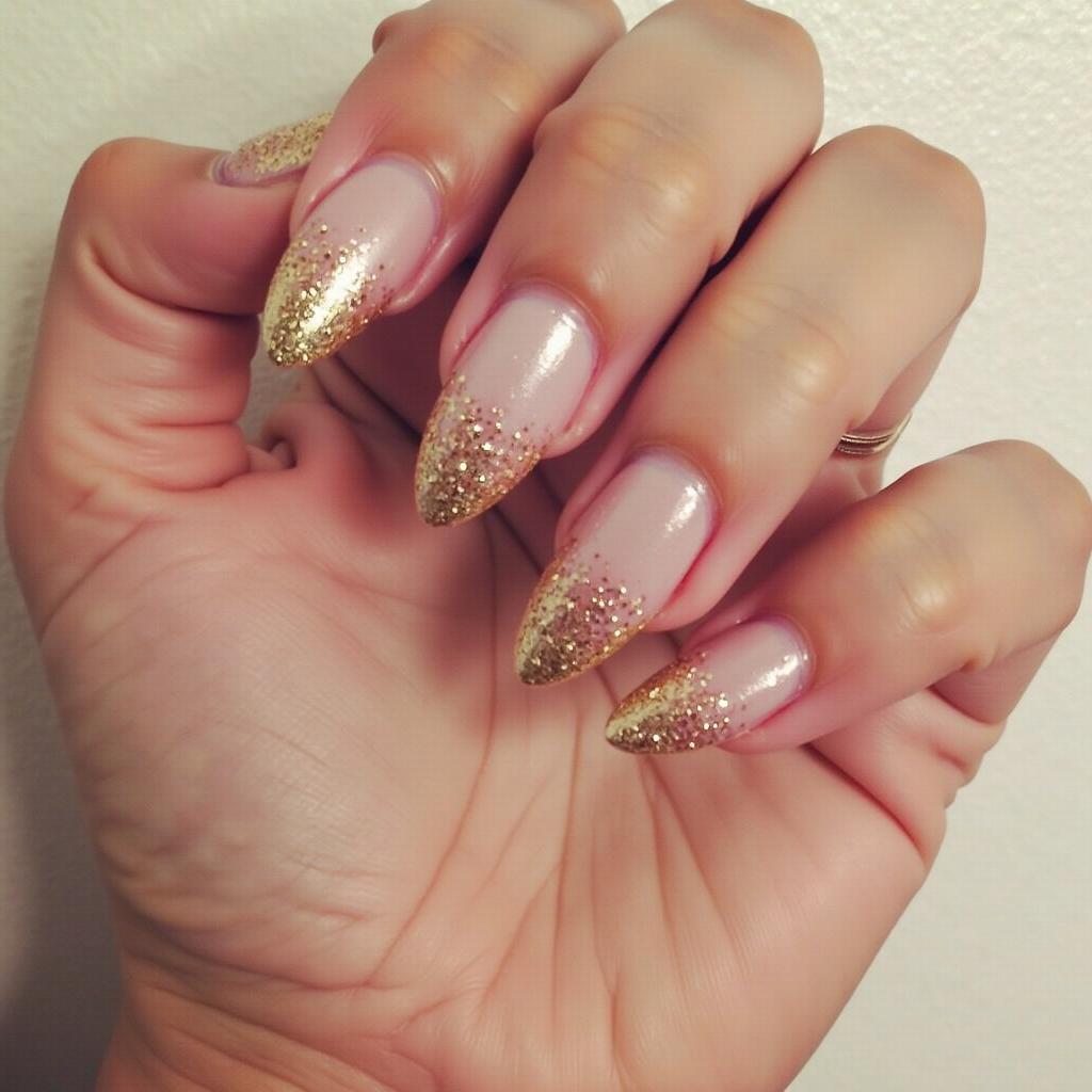 Pair a nude base with gold glitter at the tips for a luxe, sparkling ombre look that’s perfect for a night out.