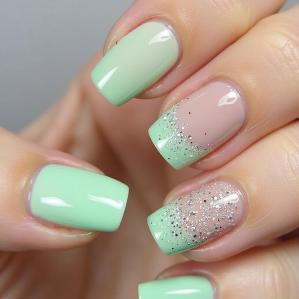 Add a touch of sparkle with glitter at the tips of mint green ombre nails for a fun and festive finish.