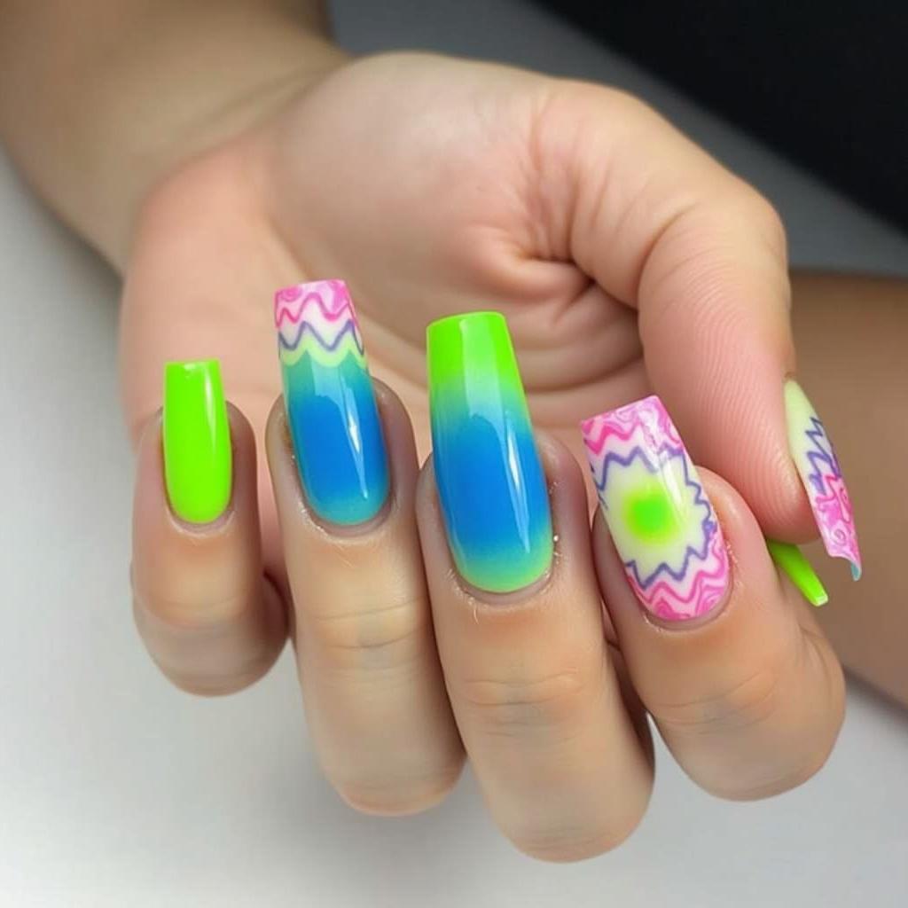 Create an energetic gradient with neon green fading into blue for an electric, eye-catching ombre design.