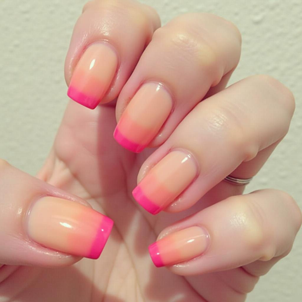 Start with neon pink tips and blend the color into a softer, neutral base for a fresh and striking look.