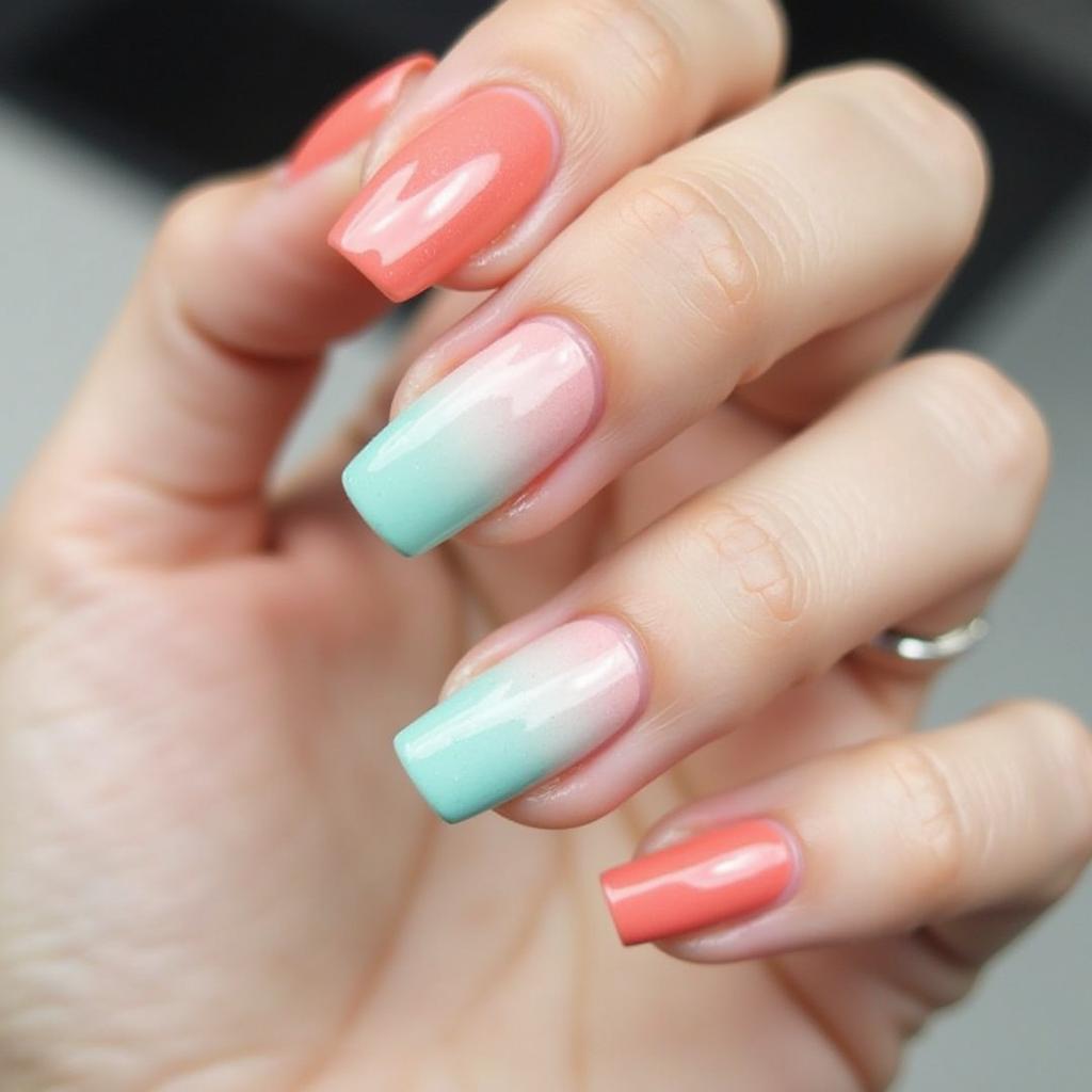 A smooth gradient from peach to mint green gives you a refreshing, vibrant ombre look for a fresh spring vibe.