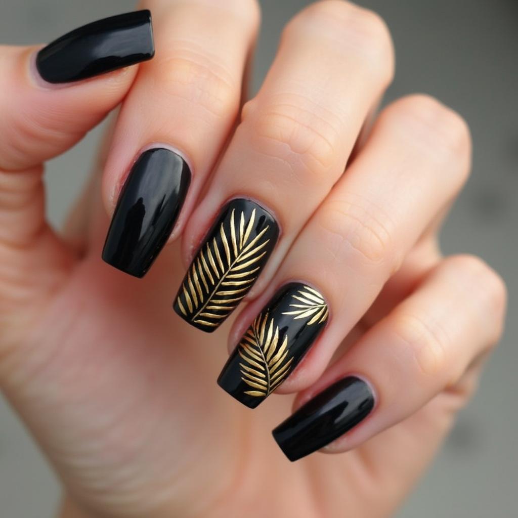 For a striking design, pair gold palm leaves on a black background for a modern take on tropical nails.