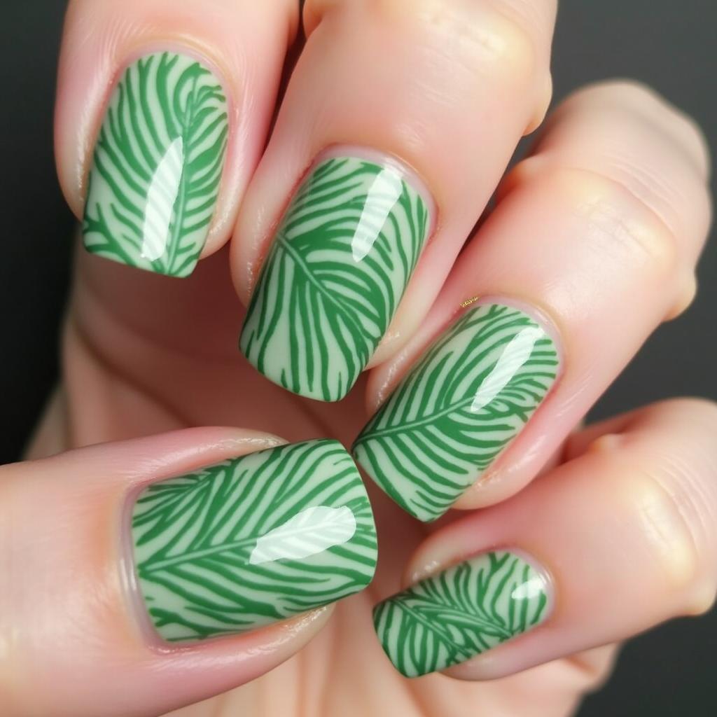Paint detailed green palm leaves on a neutral base for a tropical, vacation-inspired manicure.