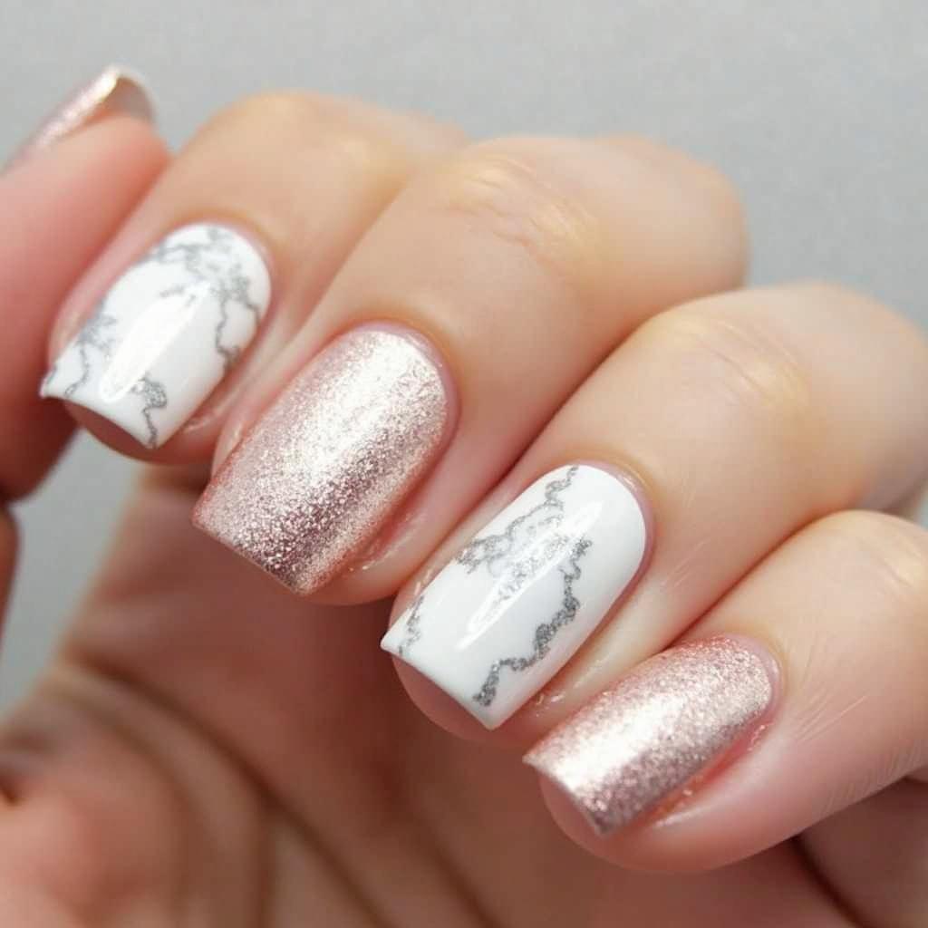 Combine silver with white marble designs for a modern, sophisticated take on metallic nails.
