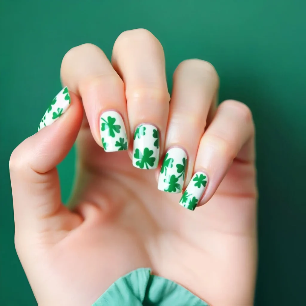Cover your nails with tiny clovers for a fresh, festive design. A green base with white or gold clovers looks especially chic.