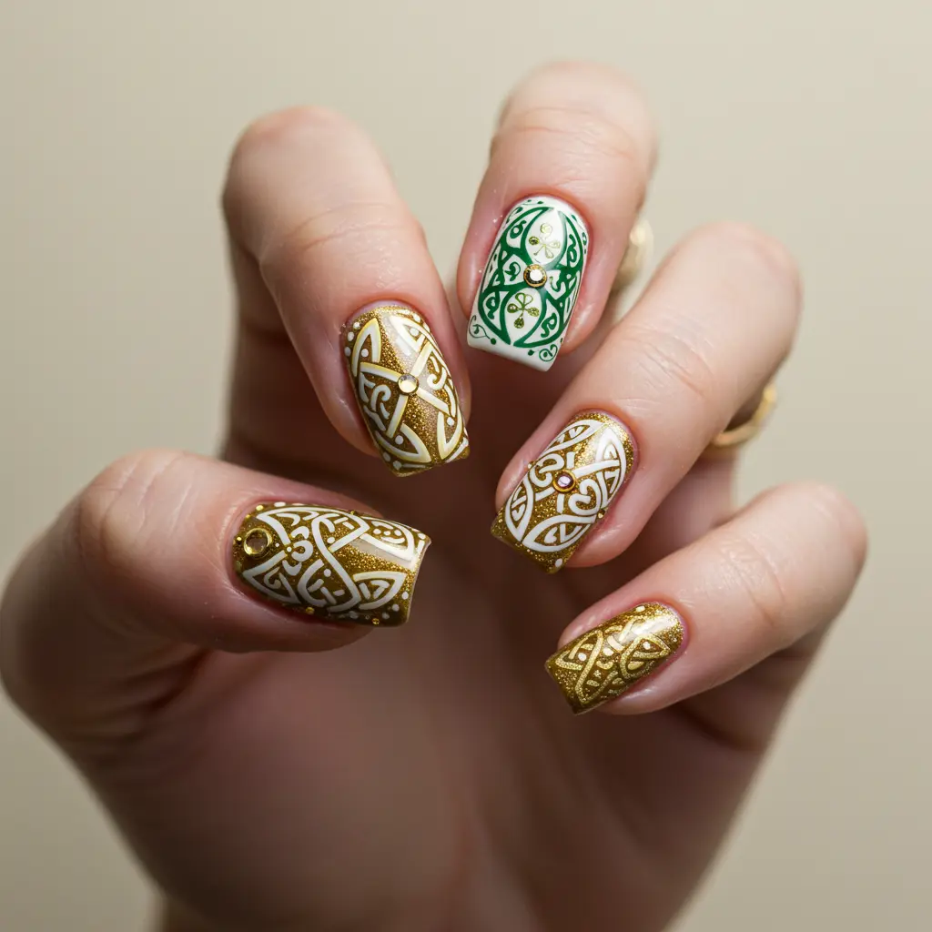 Draw inspiration from Irish heritage with intricate Celtic knot nail art in gold or white.