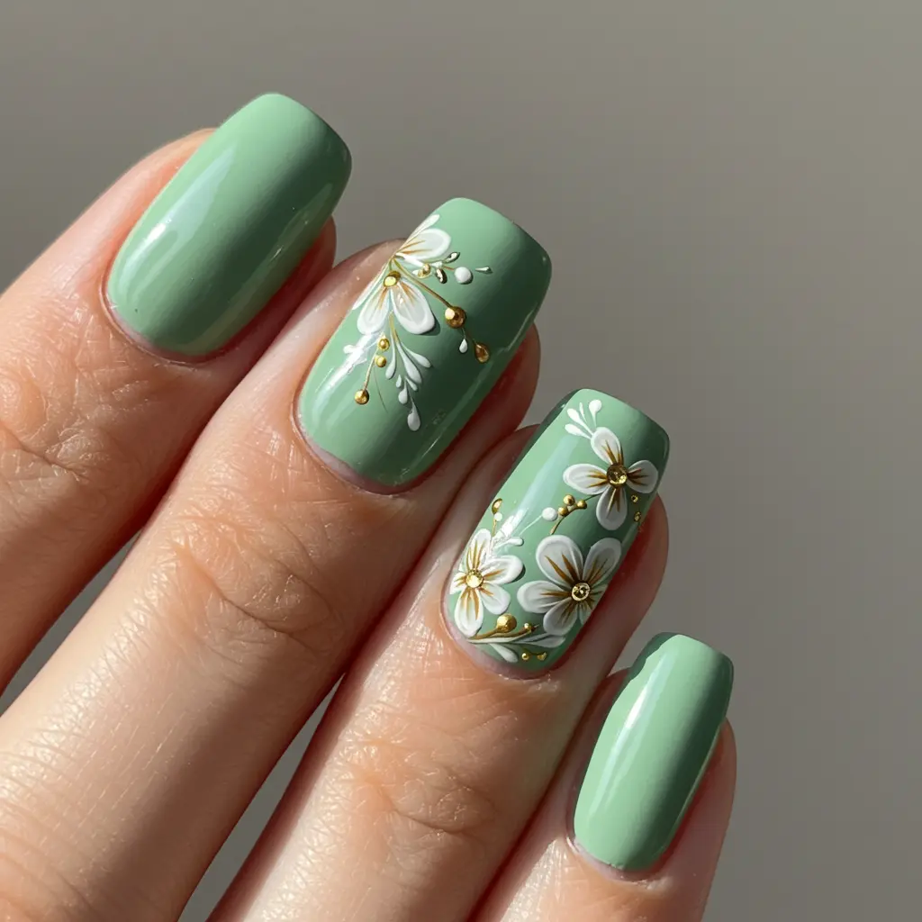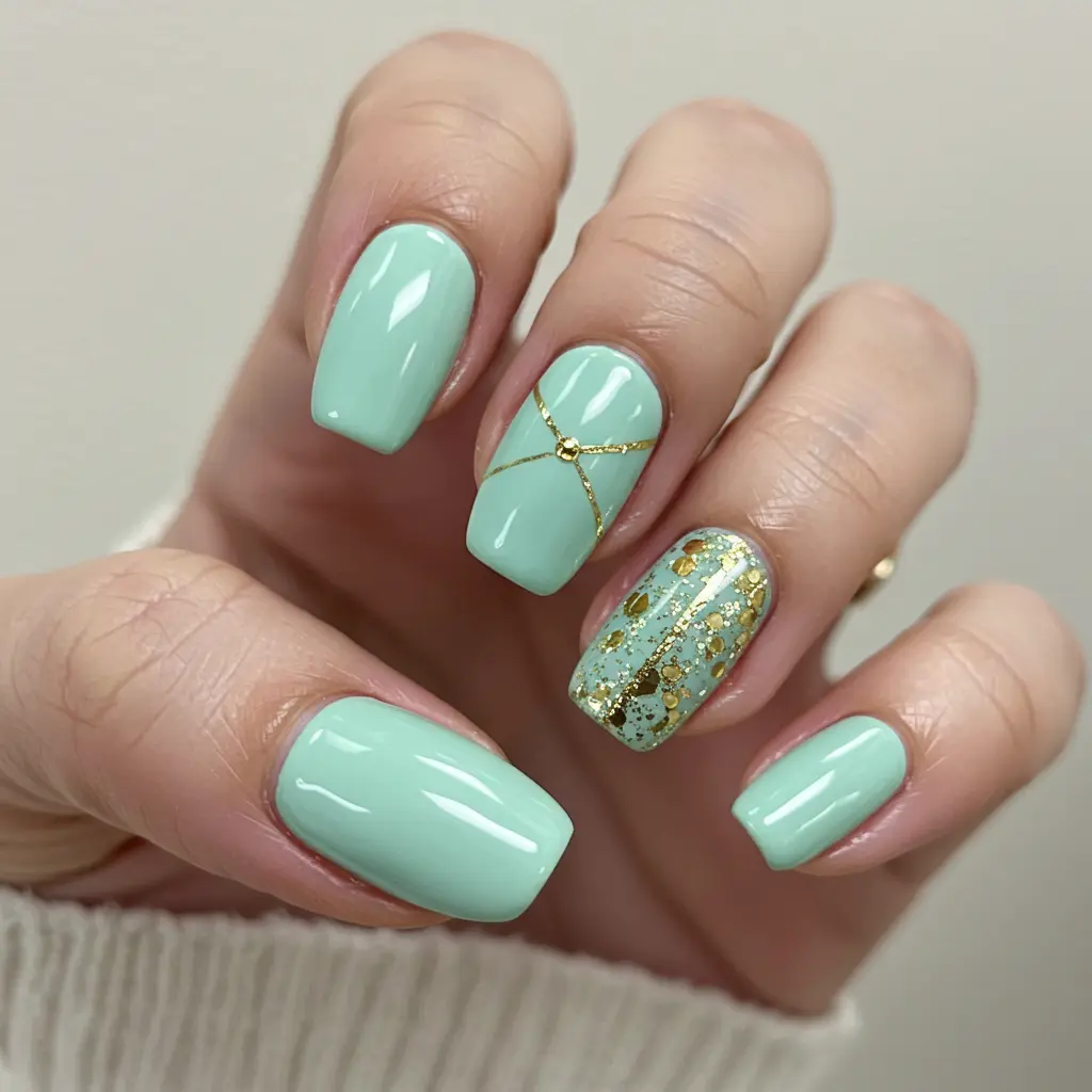 For a softer look, go for pastel mint green nails with delicate gold accents.