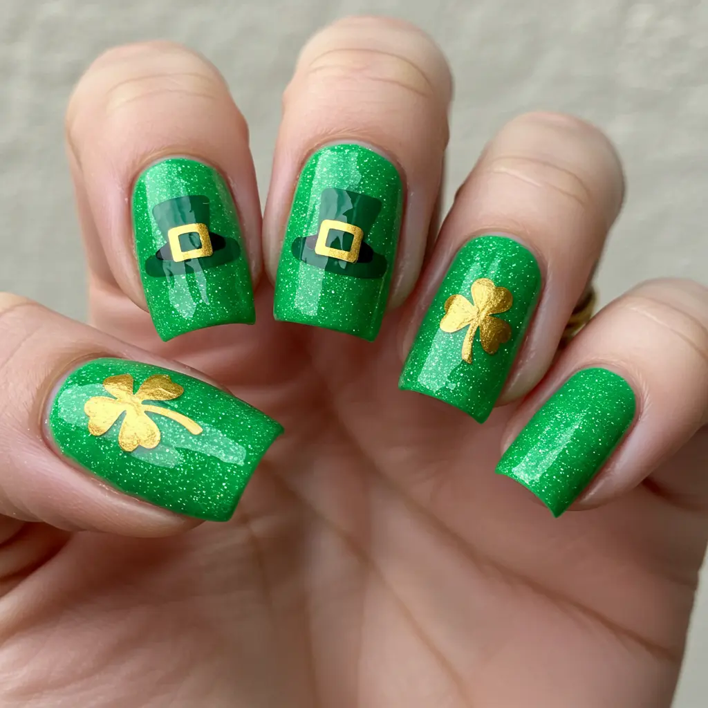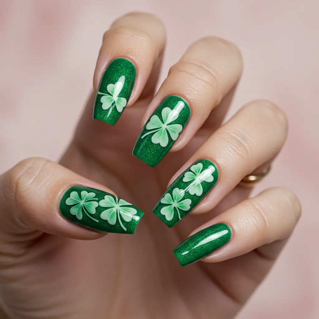For a modern touch, try matte green nails with glossy shamrock accents or gold foil details.