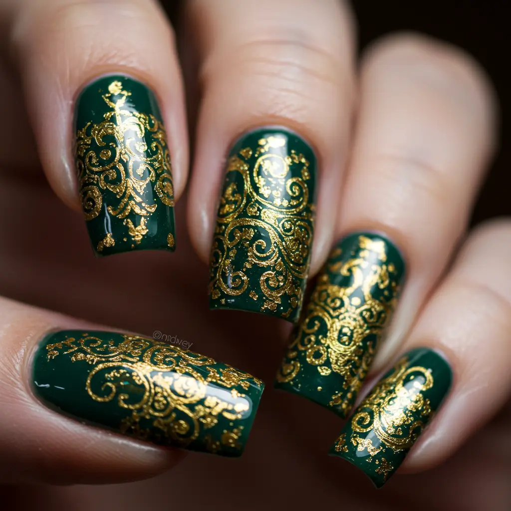Apply gold foil over dark green polish to create a luxurious, eye-catching manicure.